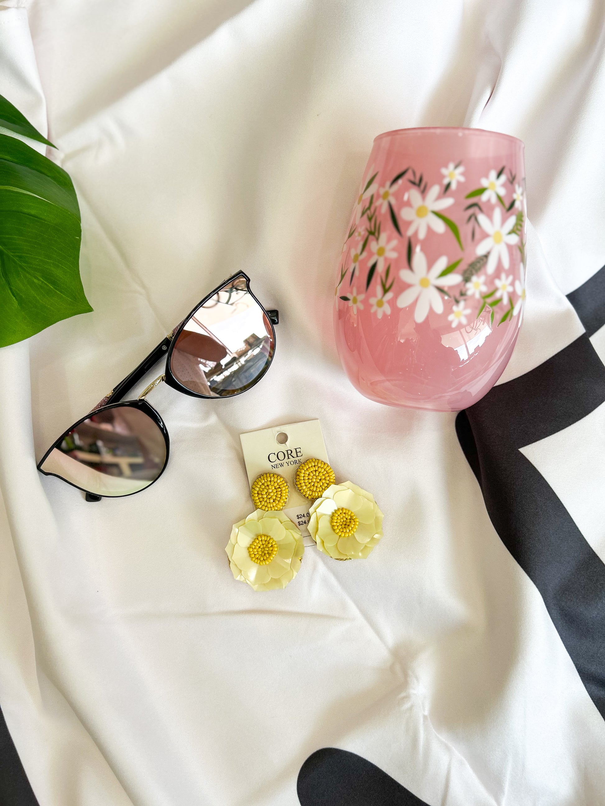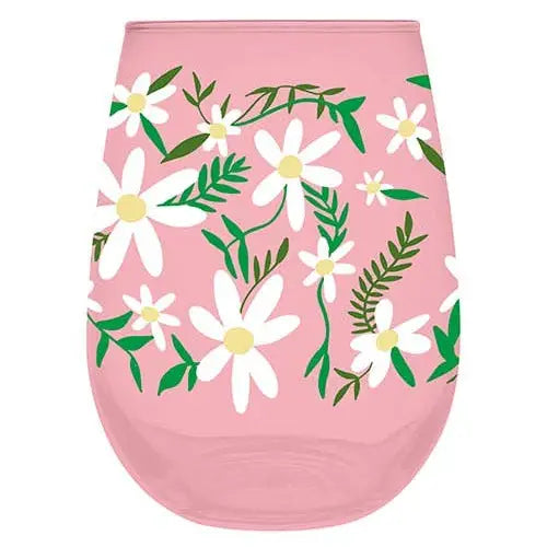 20oz glass for wine, with a daisy design. In a pretty pink color with touches of white and green.