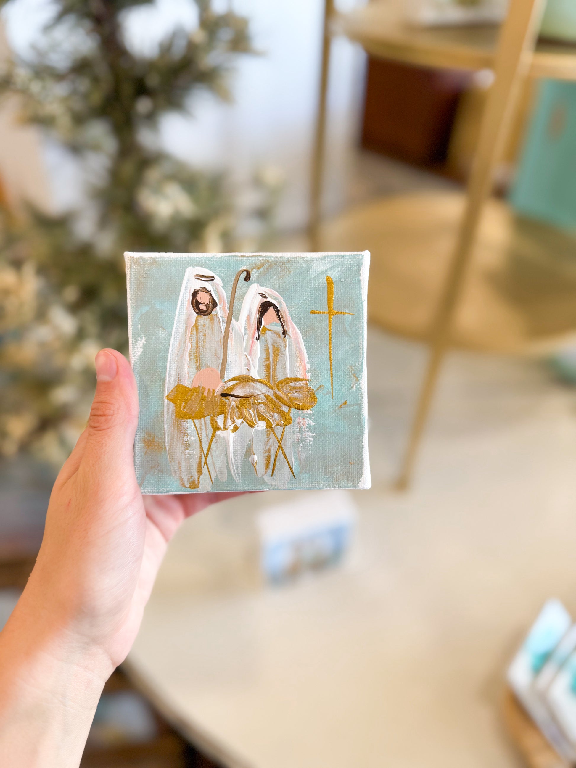 This 4x4 hand-painted nativity portrays Jesus, Mary, and Joseph in the manger, capturing the stillness and grace of the holy night. Small yet meaningful, its compact size makes it perfect for gifting, tiered trays, or small shelf displays. The soft hues and delicate brushwork bring warmth and reverence to any space.