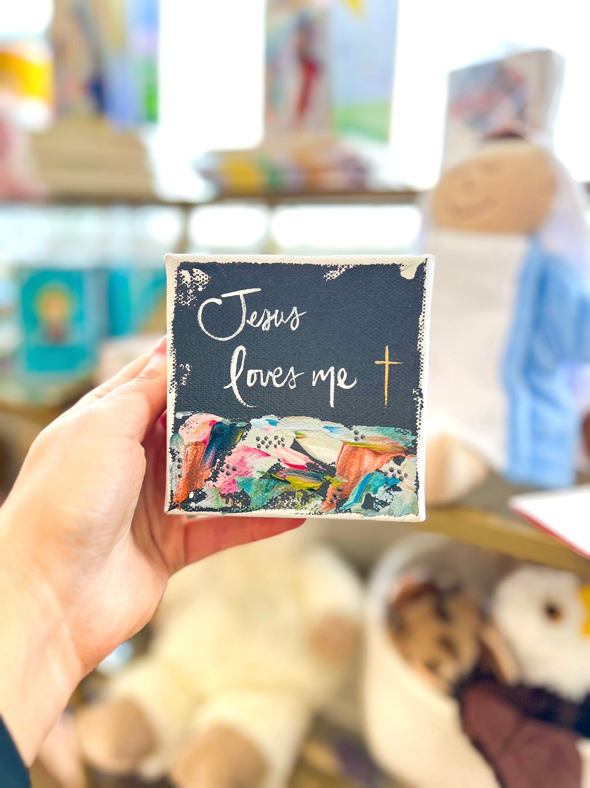 This 4x4 Jesus Loves Me canvas art is a simple yet powerful reminder of Christ’s unfailing love. Hand-painted on a rich charcoal background, this piece features thoughtful details and expressive brushstrokes that allow the message to stand boldly and beautifully. Its compact size makes it perfect for desks, shelves, nightstands, prayer corners, or as a meaningful faith-filled gift for someone special.