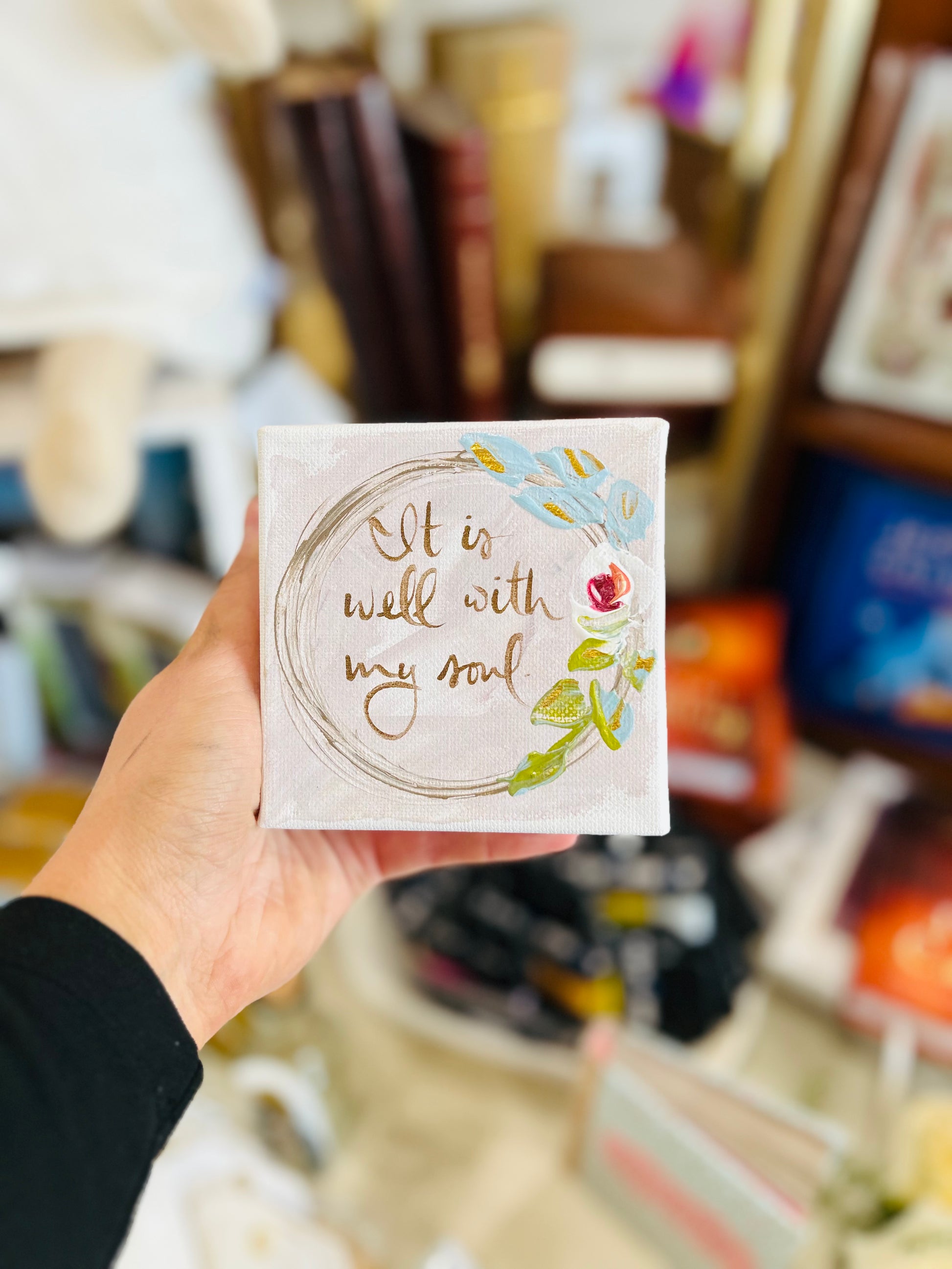 This 4x4 It Is Well with My Soul canvas art is a timeless declaration of peace and unwavering faith. Hand-painted with a delicate floral wreath and expressive brushstrokes, this piece beautifully surrounds its powerful message with soft, thoughtful detail. Its petite size makes it perfect for desks, shelves, nightstands, prayer spaces, or as a meaningful gift to bring comfort and reassurance in any season.