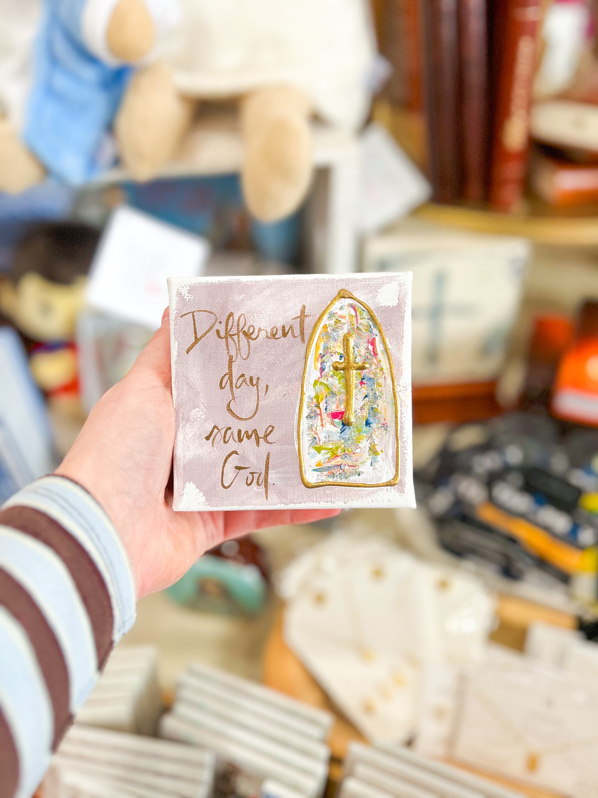 This 4x4 Different Day, Same God canvas art is a powerful reminder of God’s constant presence and unchanging faithfulness. Hand-painted on a rich purple background with thoughtful brushstrokes, this piece carries a message of reassurance, strength, and daily trust. Its petite size makes it perfect for desks, shelves, nightstands, prayer spaces, or as a meaningful gift to encourage faith through every season.