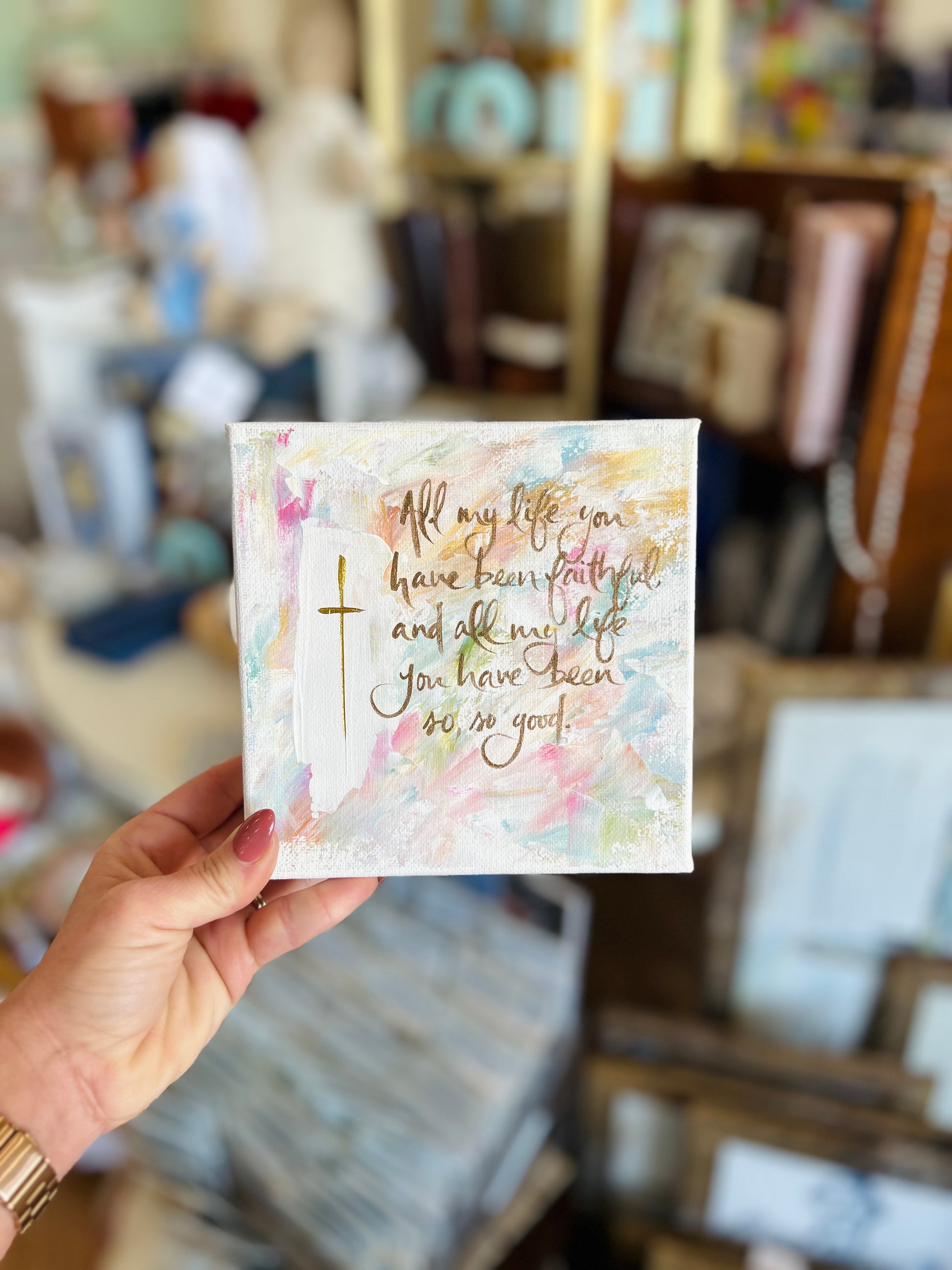 This 6x6 All My Life canvas art features a soft pastel background accented with a sweet heart detail, creating a tender expression of love and devotion. Hand-painted with gentle brushstrokes and calming tones, this piece brings warmth and meaning to any space. Its petite size makes it perfect for bedrooms, shelves, nurseries, or as a heartfelt gift that celebrates enduring love and cherished moments.