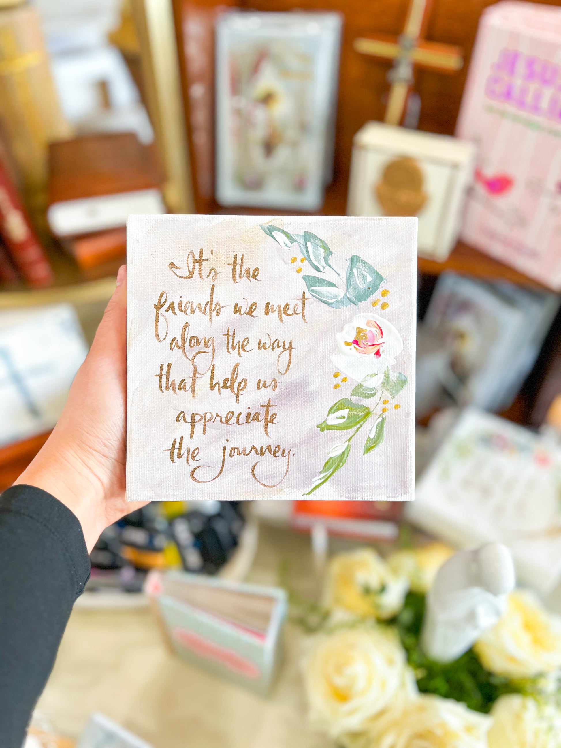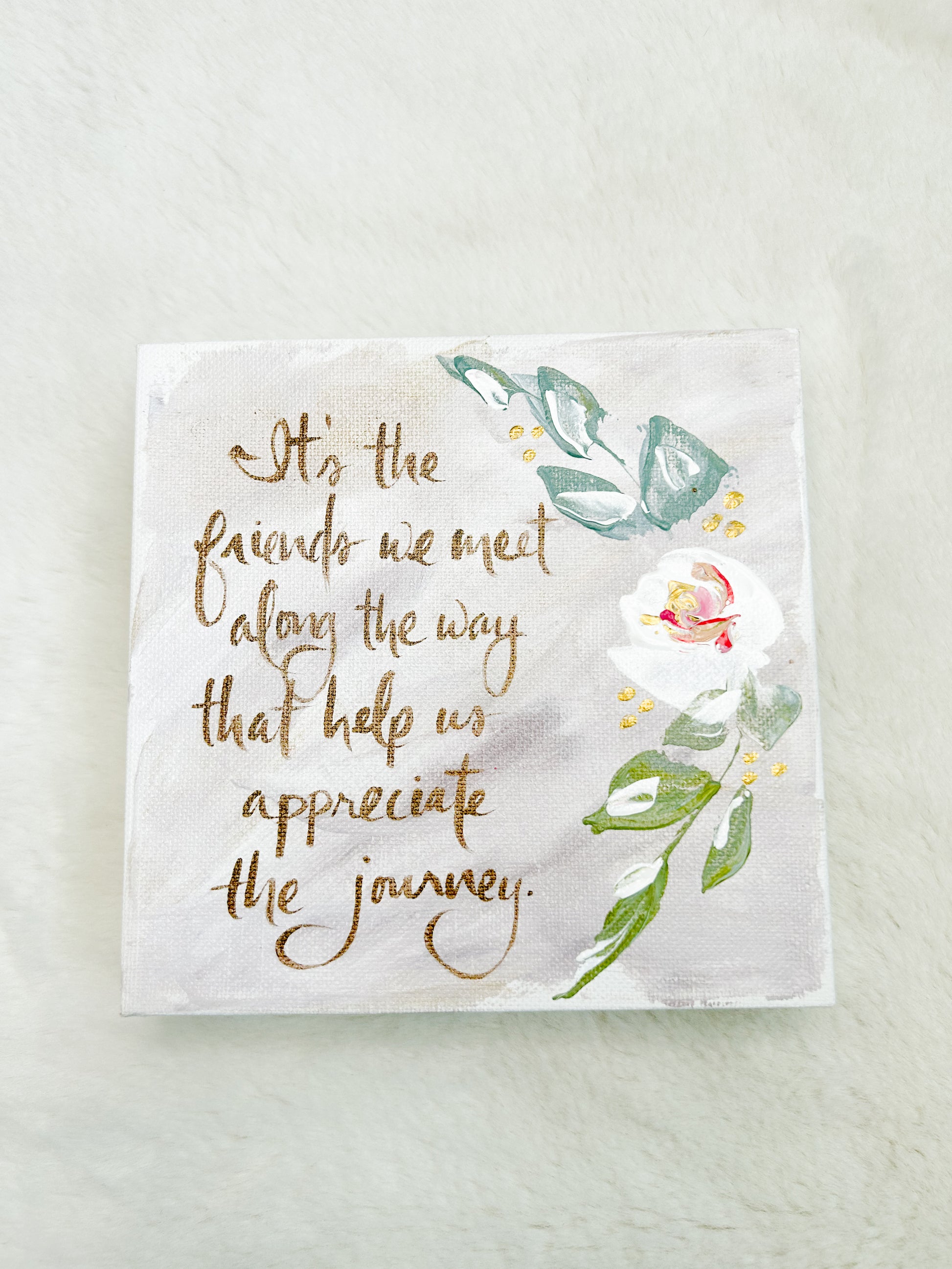 This 6x6 It’s The Friends We Meet canvas art features a rich purple background that beautifully highlights its heartfelt message about friendship and life’s journey. Hand-painted with expressive brushstrokes and thoughtful detail, this piece adds warmth, encouragement, and personality to any space. Its petite size makes it perfect for desks, shelves, nightstands, or as a meaningful gift for a cherished friend.