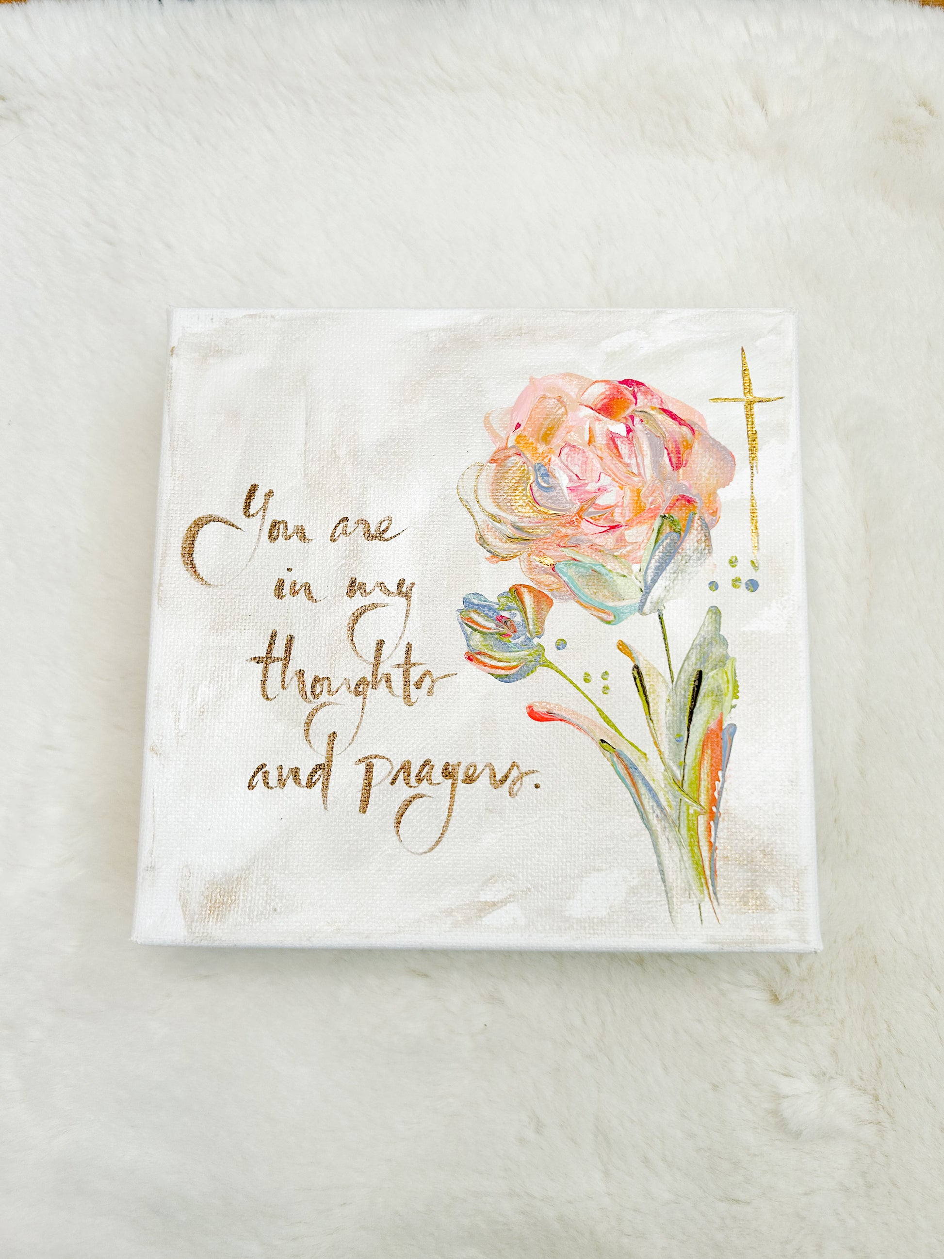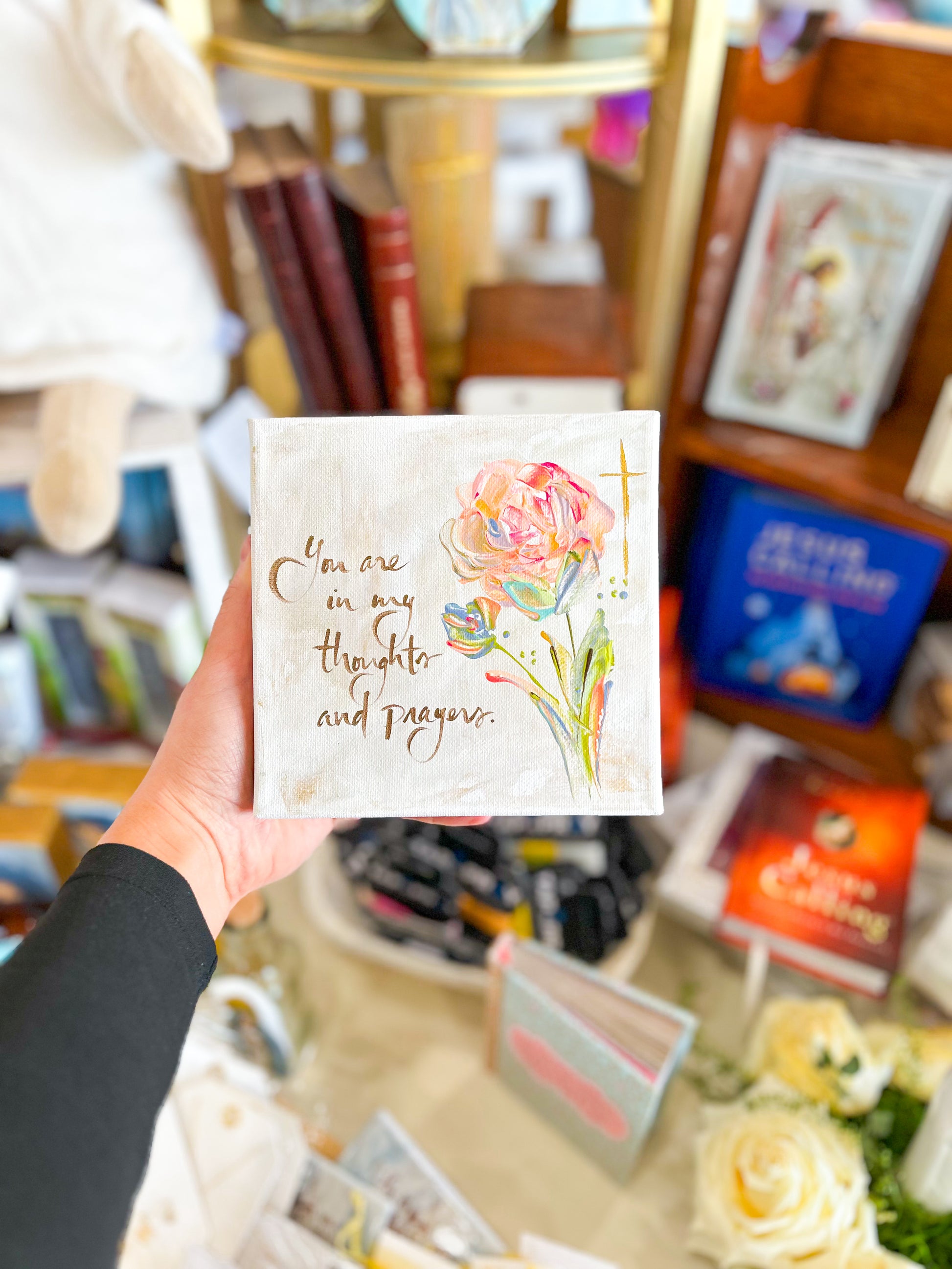 This 6x6 You Are In My Thoughts canvas art features soft pink pastel florals that beautifully convey care, comfort, and heartfelt sentiment. Hand-painted with gentle brushstrokes and delicate detail, this piece offers a meaningful way to express love and support. Its petite size makes it perfect for bedside tables, desks, shelves, or as a thoughtful gift to let someone know they are truly cherished.