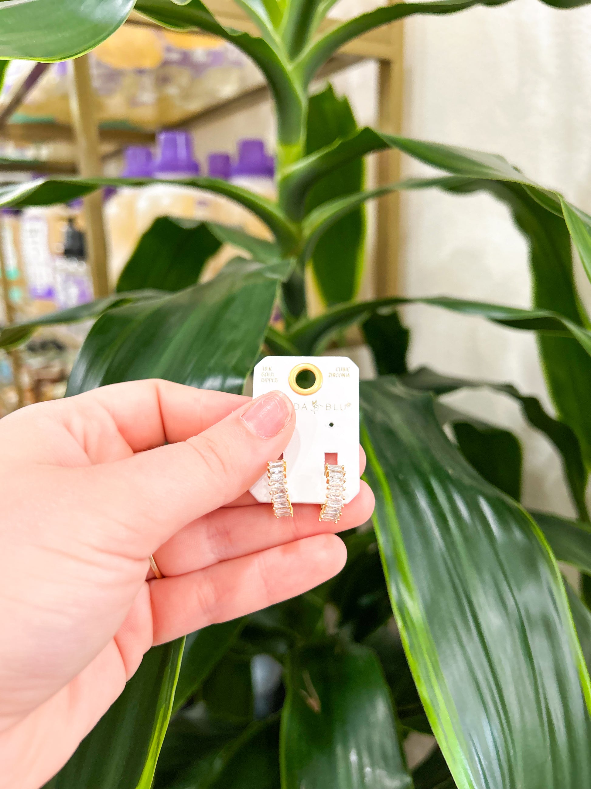 Add a touch of sparkle and whimsy to your look with our Amanda Baguette Earrings! These small huggie earrings feature a beautiful baguette CZ, perfect for any occasion. Get ready to make a statement with these unique and playful earrings!