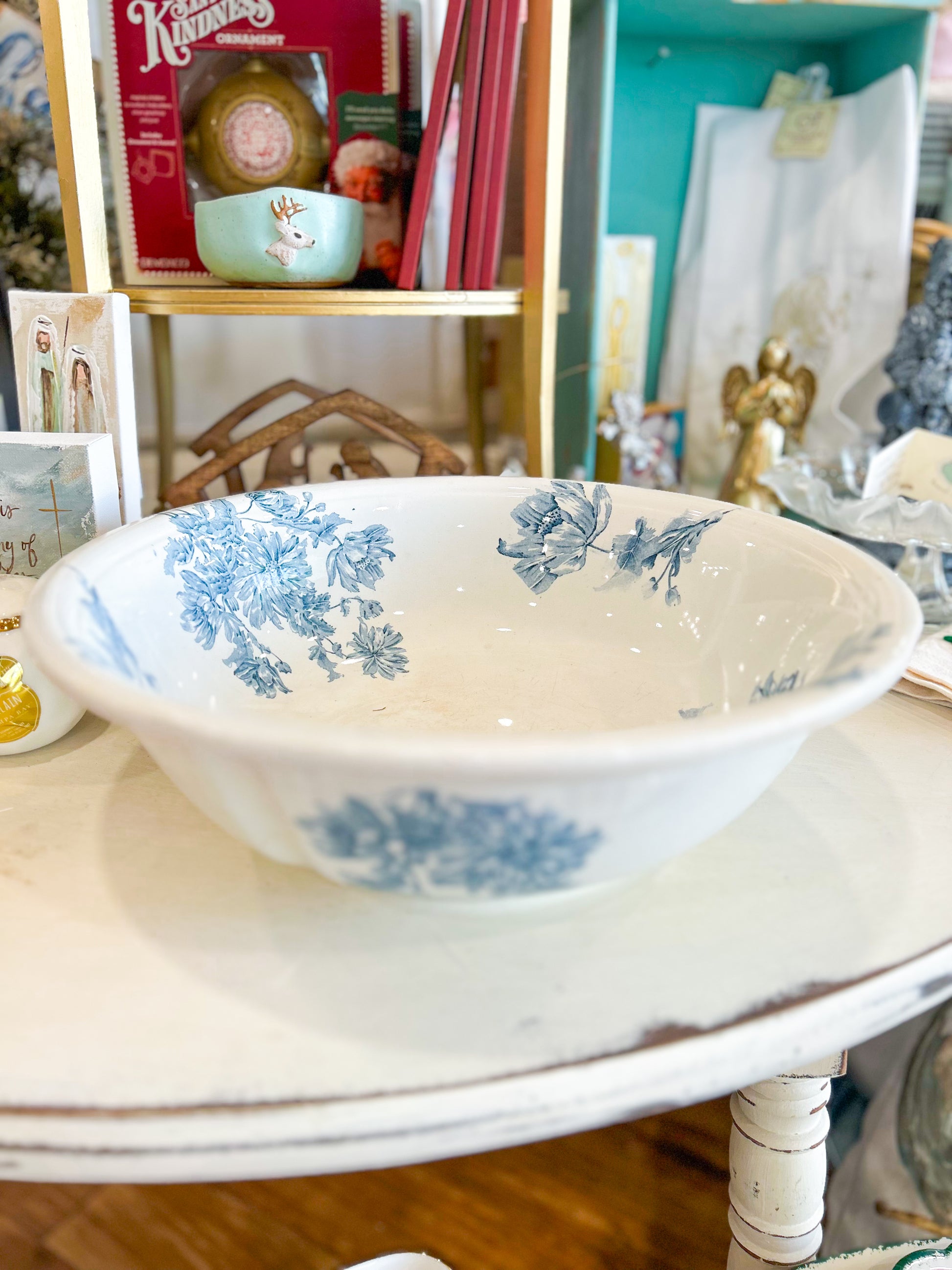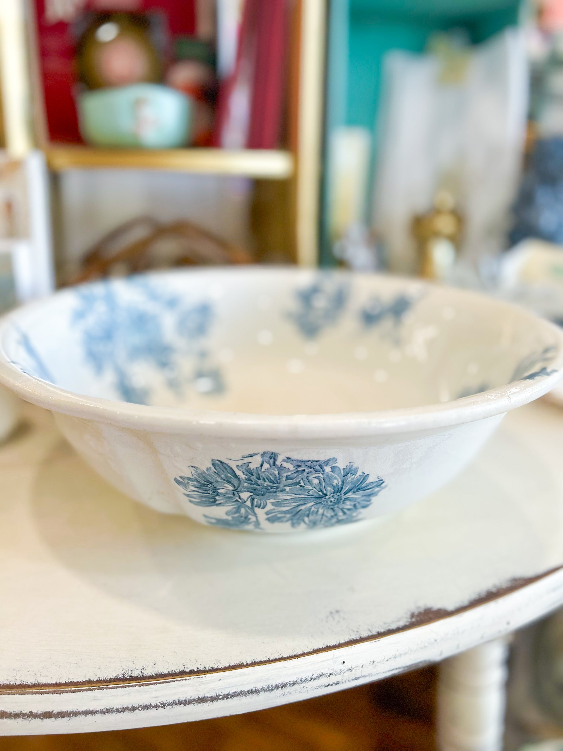 A large glass bowl featuring a charming blackberry blue motif. Reimagined for serving salads, displaying fruit, or adding a pop of vintage color to your kitchen décor. Both beautiful and practical, it’s a timeless piece for everyday use.