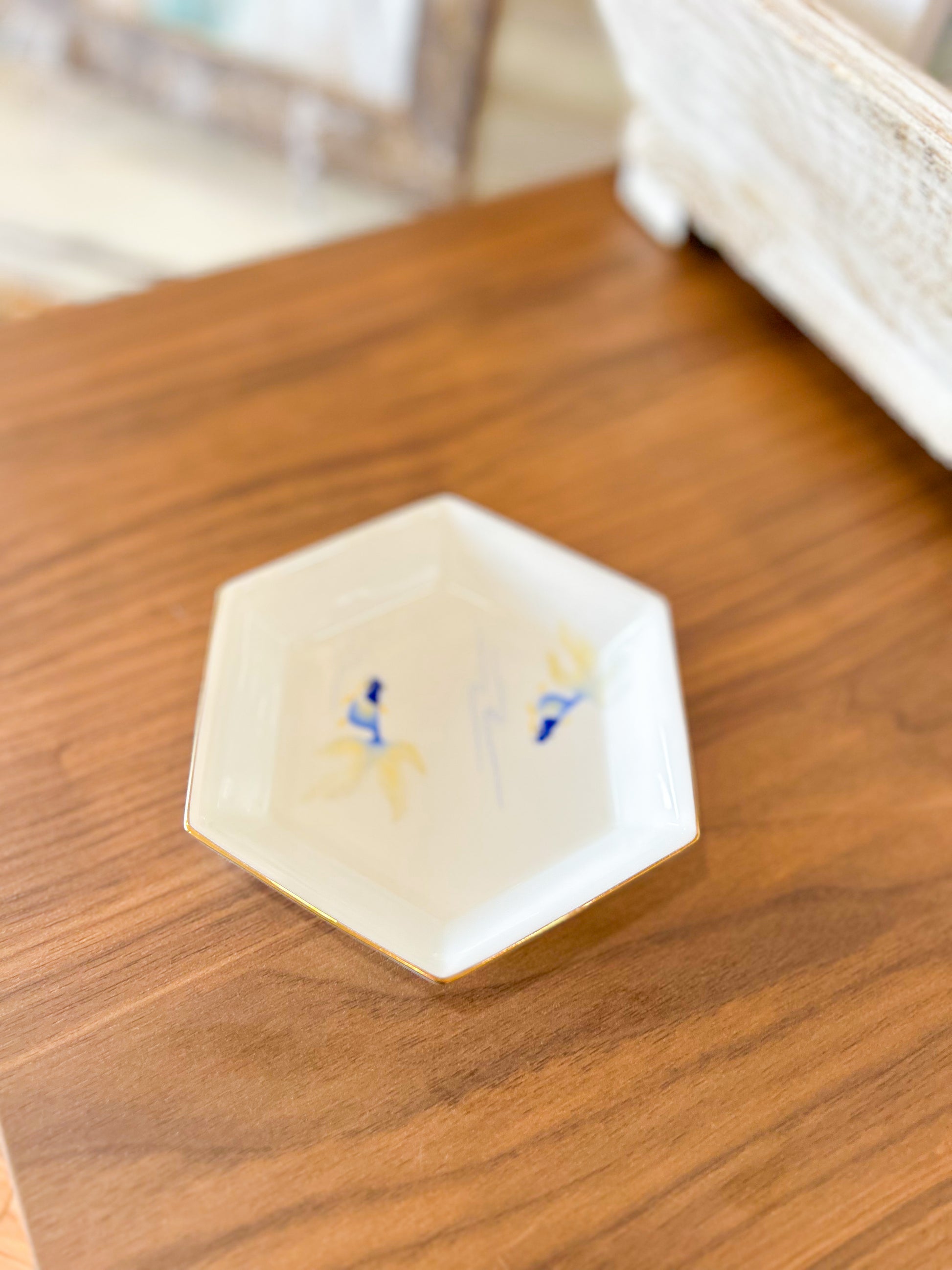A vintage Japanese porcelain trinket dish, delicately crafted and finished with subtle traditional detailing. Once a decorative accent, now thoughtfully reimagined as a trinket dish, jewelry holder, or rosary holder, bringing timeless charm and quiet elegance to any shelf or dresser.