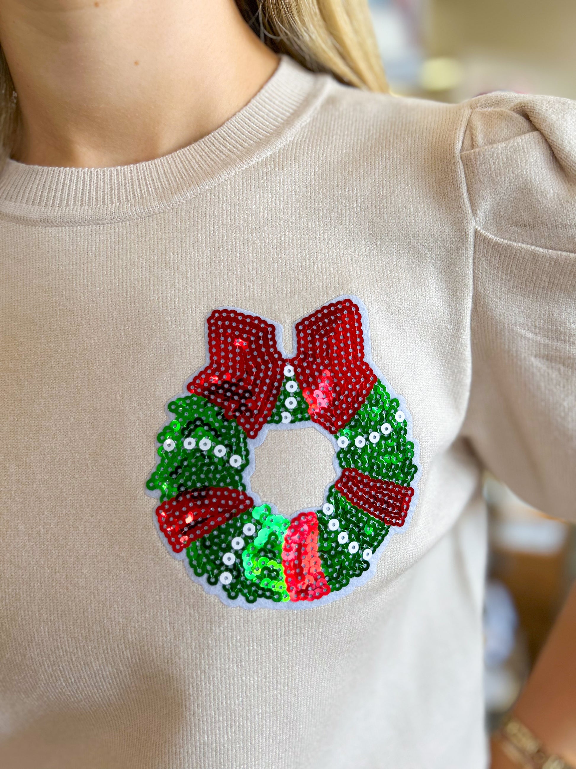 Christmas Wreath Short Sleeve Sweater - Cream