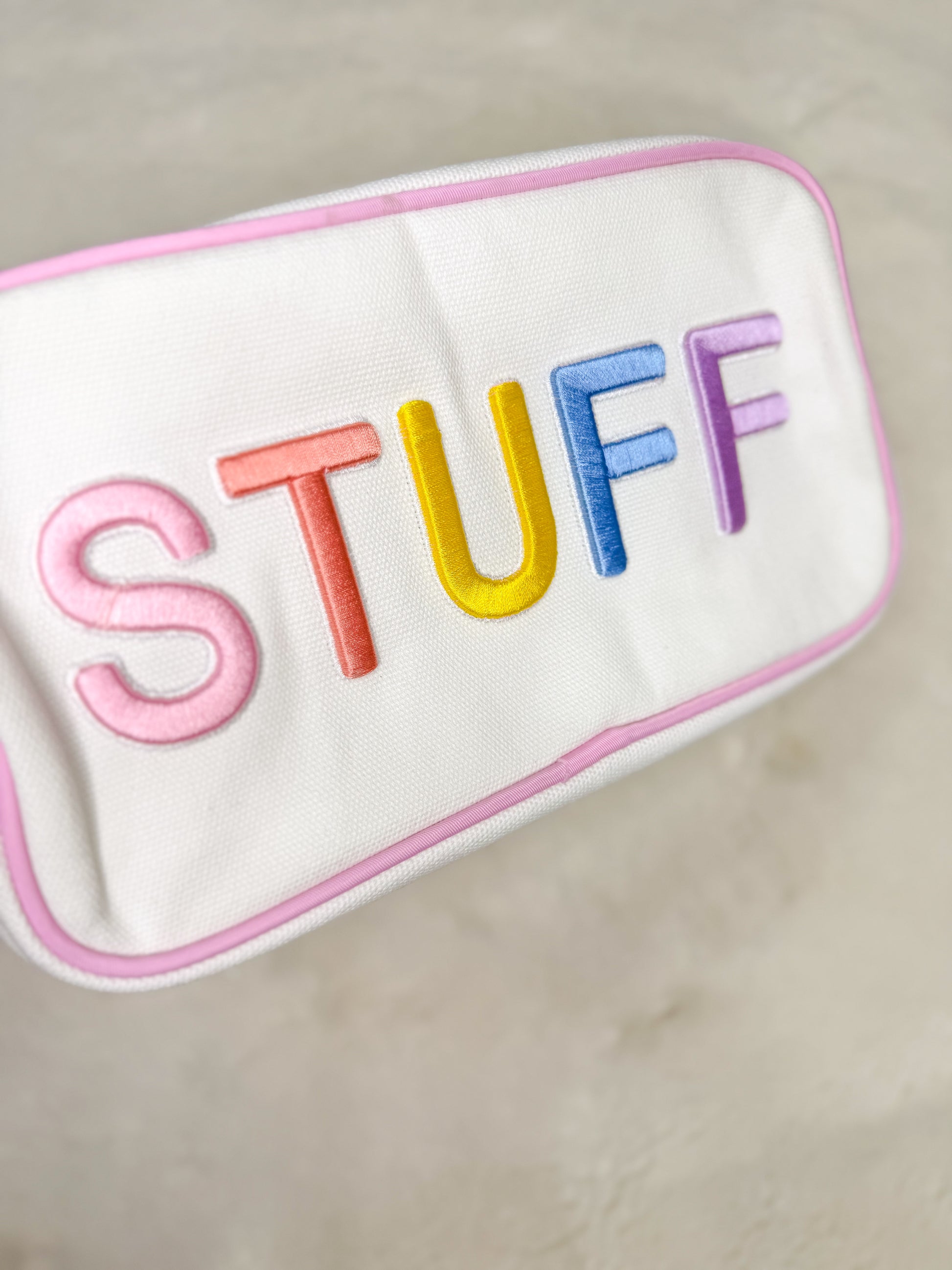 Keep your essentials organized in style with this fun cosmetic bag featuring bold, multi-colored "Stuff" lettering. Perfect for storing makeup, skincare, or travel necessities, this white bag adds a playful touch to your daily routine. The durable design keeps everything secure while the eye-catching design makes it easy to spot in your bag. Whether you're heading to the gym, on vacation, or just need a cute way to corral your favorite products, this bag has got your stuff covered!