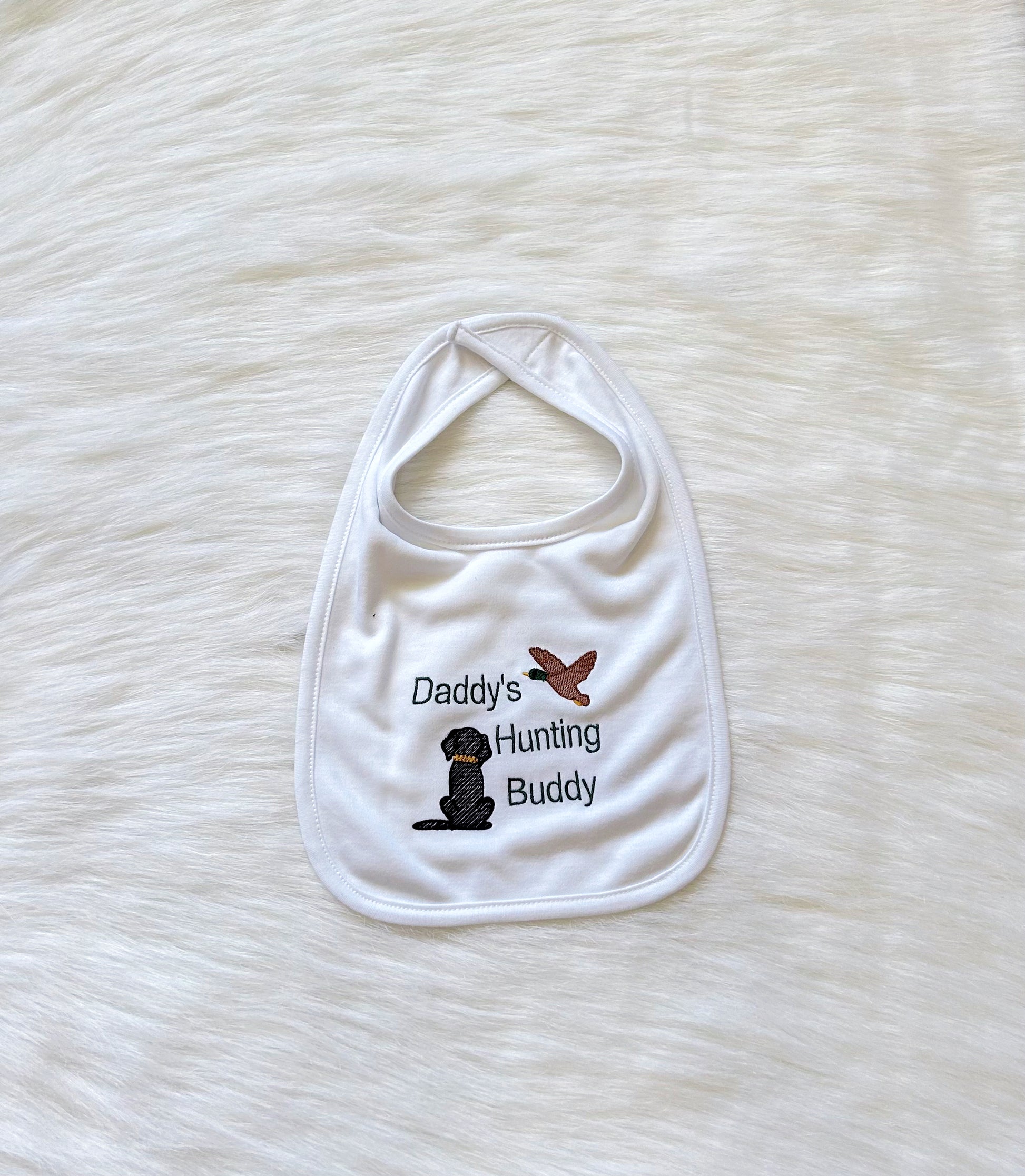 Get your little one ready for hunting season with our Daddy's Hunting Buddy Bib! This cute bib features a playful design perfect for your baby boy and proudly declares their role as dad's hunting buddy. Keep them clean and looking adorable during your outdoor adventures!