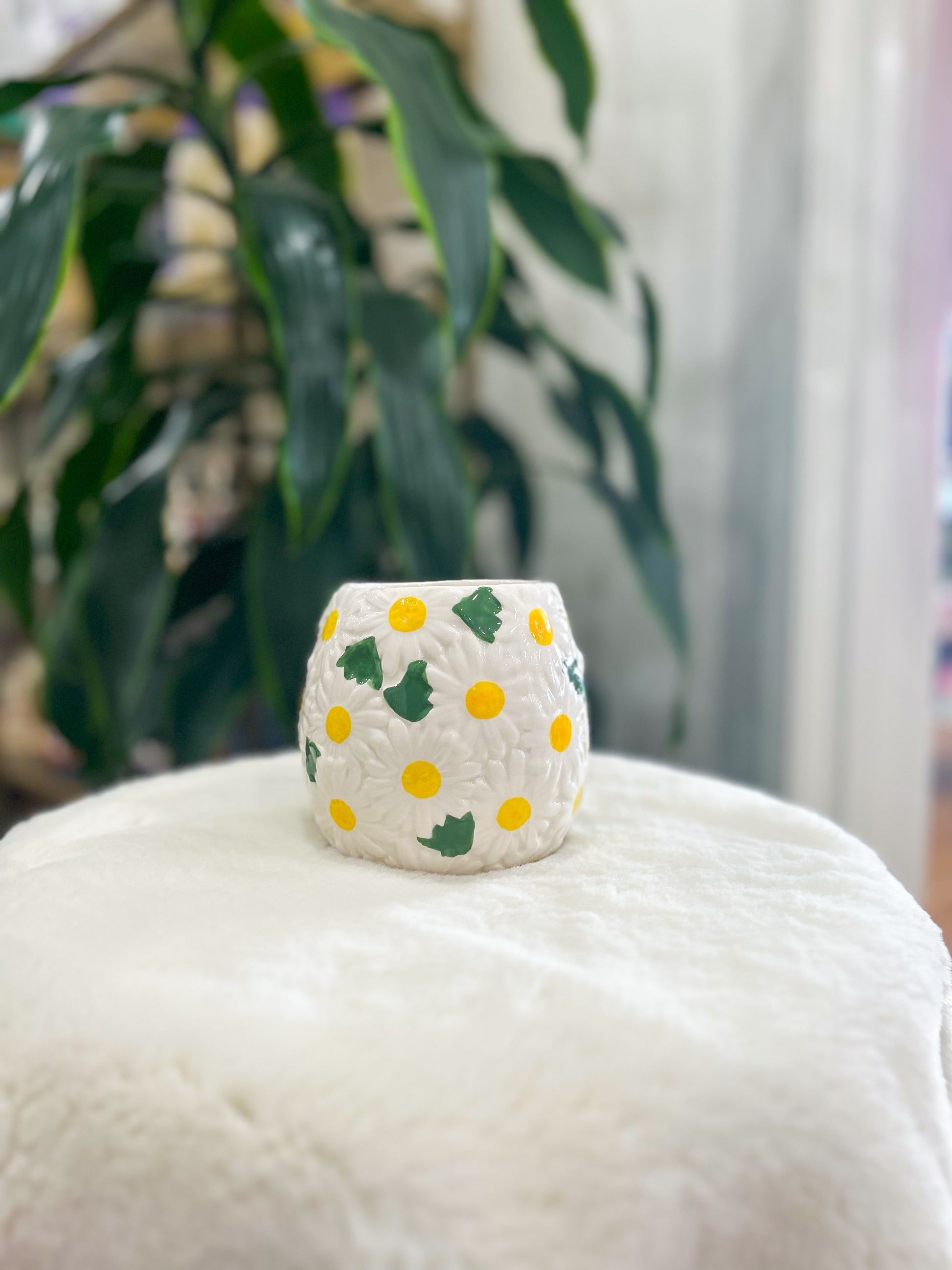 Spruce up your home with this white Daisy planter, featuring a pop of yellow and green. It's perfect for any indoor space!