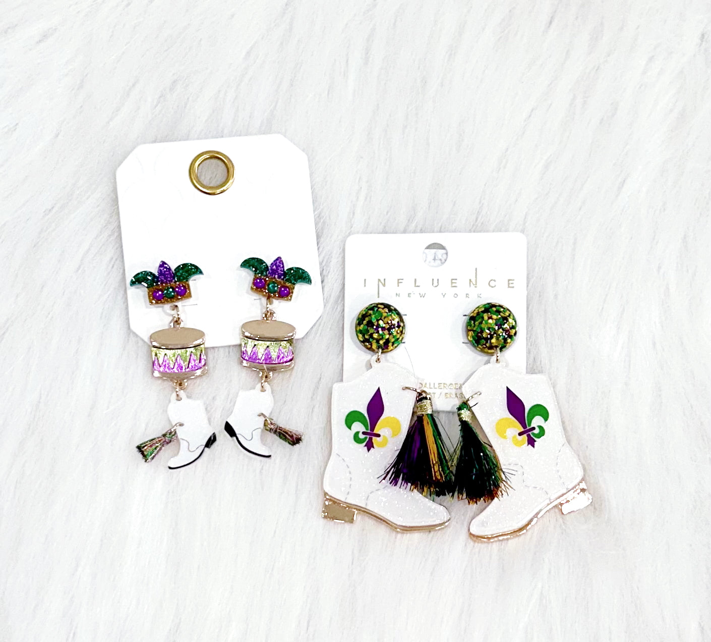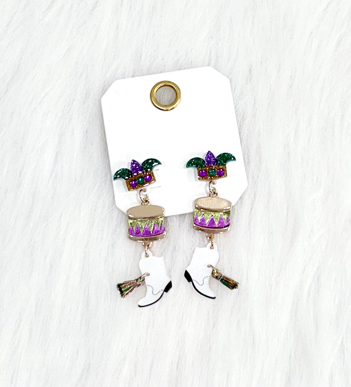 Add a touch of whimsy to your outfit with Drumbeat Boots Earrings! These funky Mardi Gras-inspired earrings are sure to make a statement and jazz up any look.