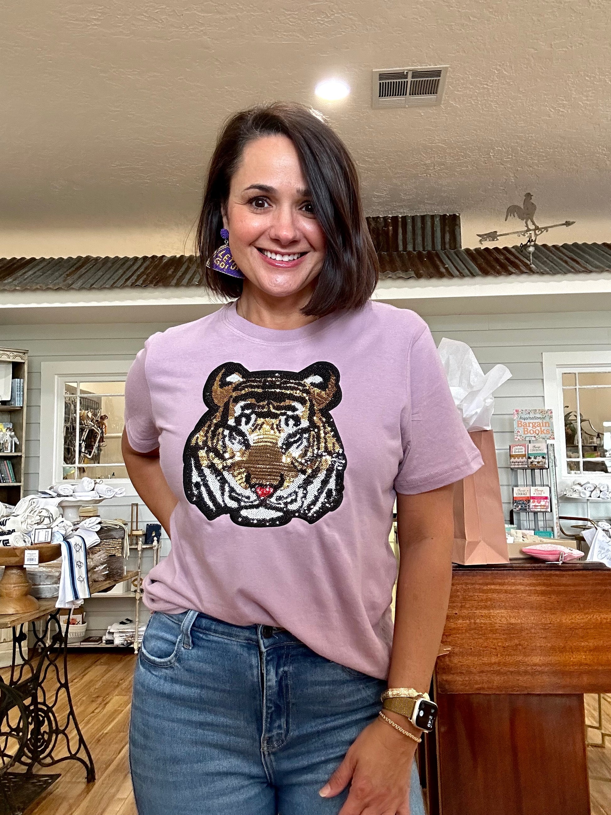 Get ready to roar on gameday with this Dusty Lavender Tiger Sequin Tee! This unique shirt features a fierce tiger design and is the perfect way to show your support for LSU. Stand out from the crowd with this playful and eye-catching tee. (Gameday never looked so good!)