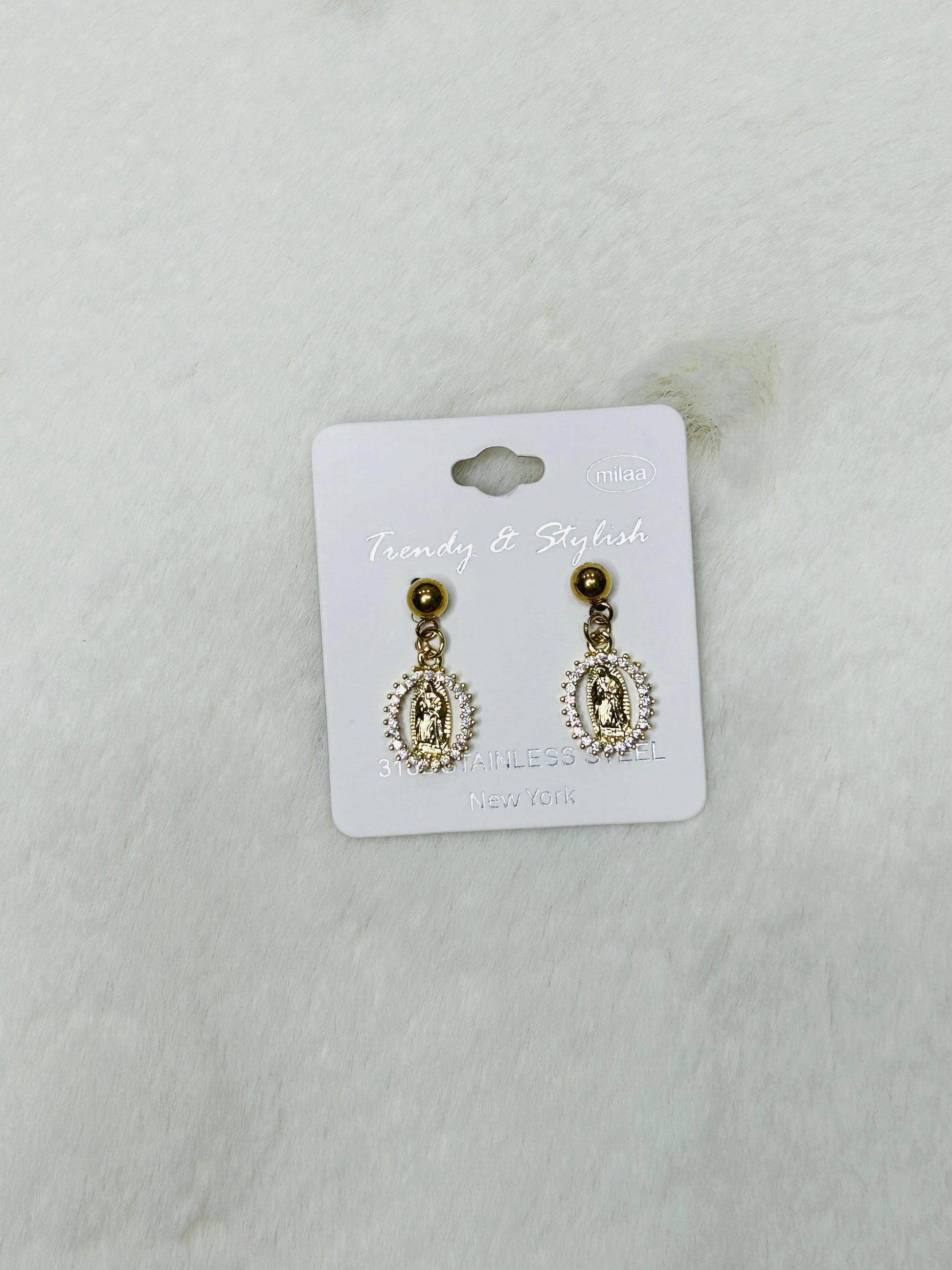 Gentle Mother Our Lady of Guadalupe Medal Gold & Diamond Dangle Earrings