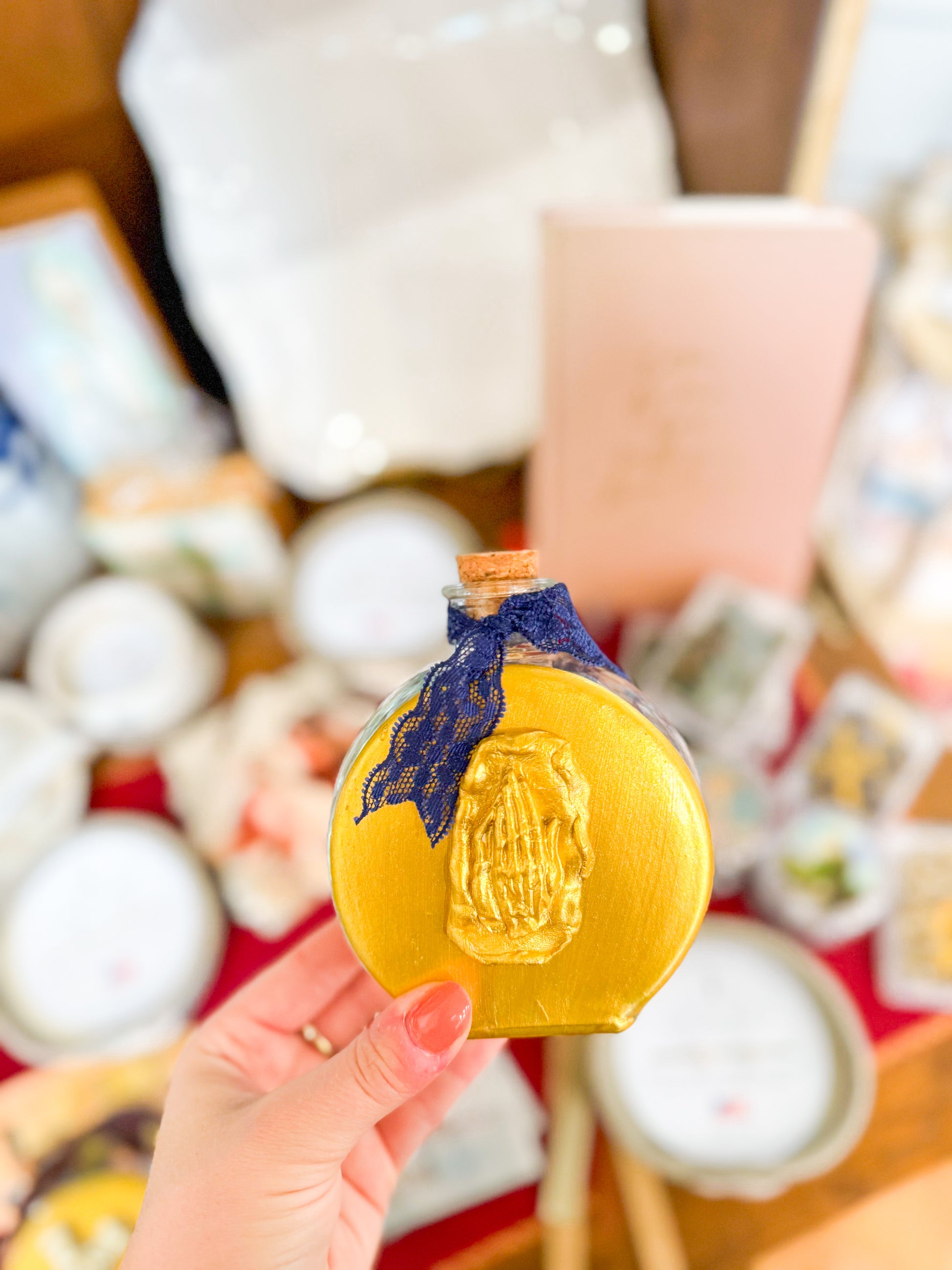 Elevate your spiritual practice with this elegant Glass Praying Hands Holy Water Container, adorned with a delicate navy lace accent. Crafted with intricate detail, it offers a refined way to store and bless your holy water. Its sophisticated design blends tradition with timeless beauty, making it a meaningful addition to any sacred space or personal altar.