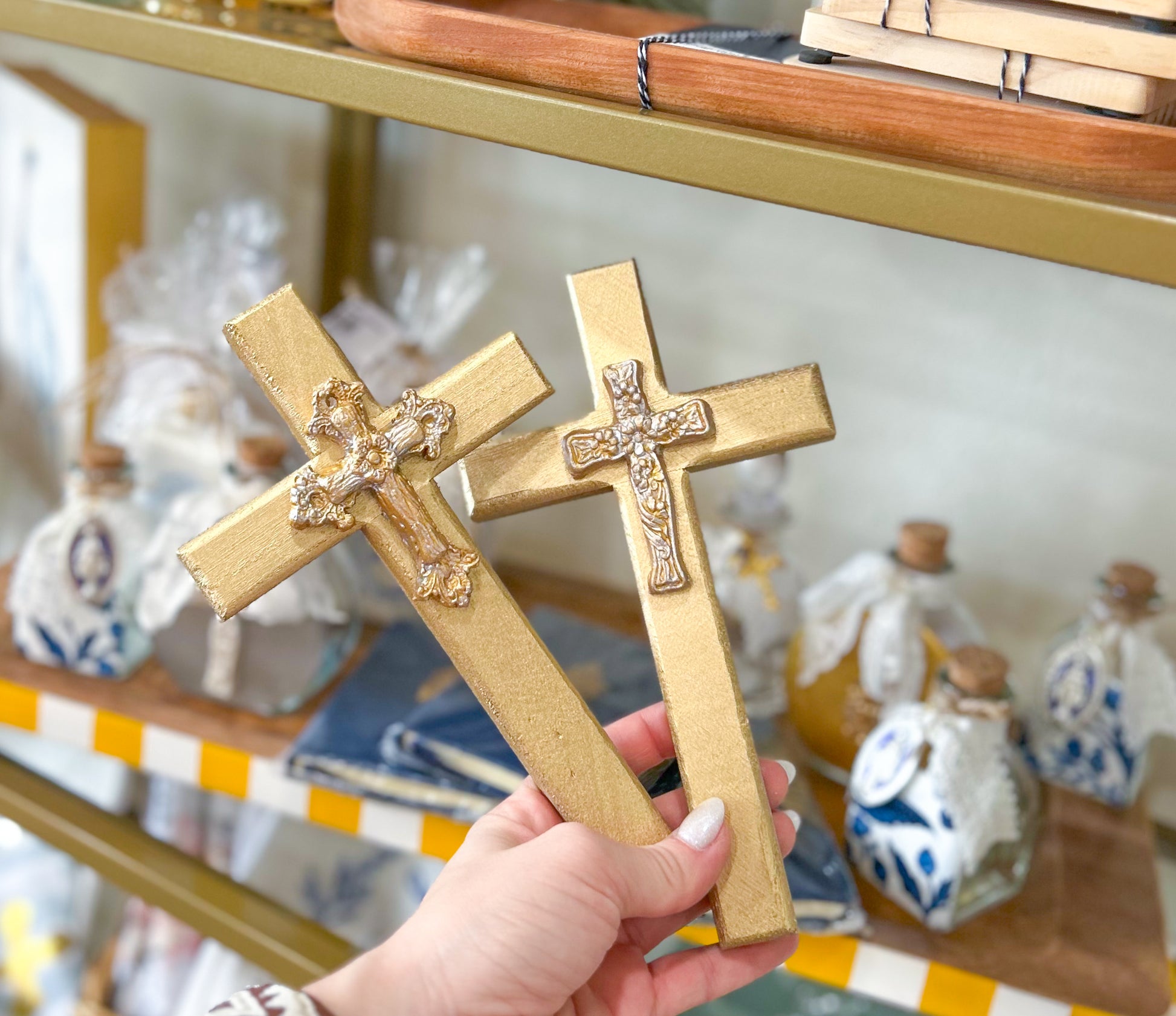 Add some divine charm to your home decor with our Gold Wooden Cross with Clay Cross! Made of high-quality wood, this decorative cross adds a rustic touch with its unique clay cross design. Perfect for those seeking a quirky and fun addition to their space.