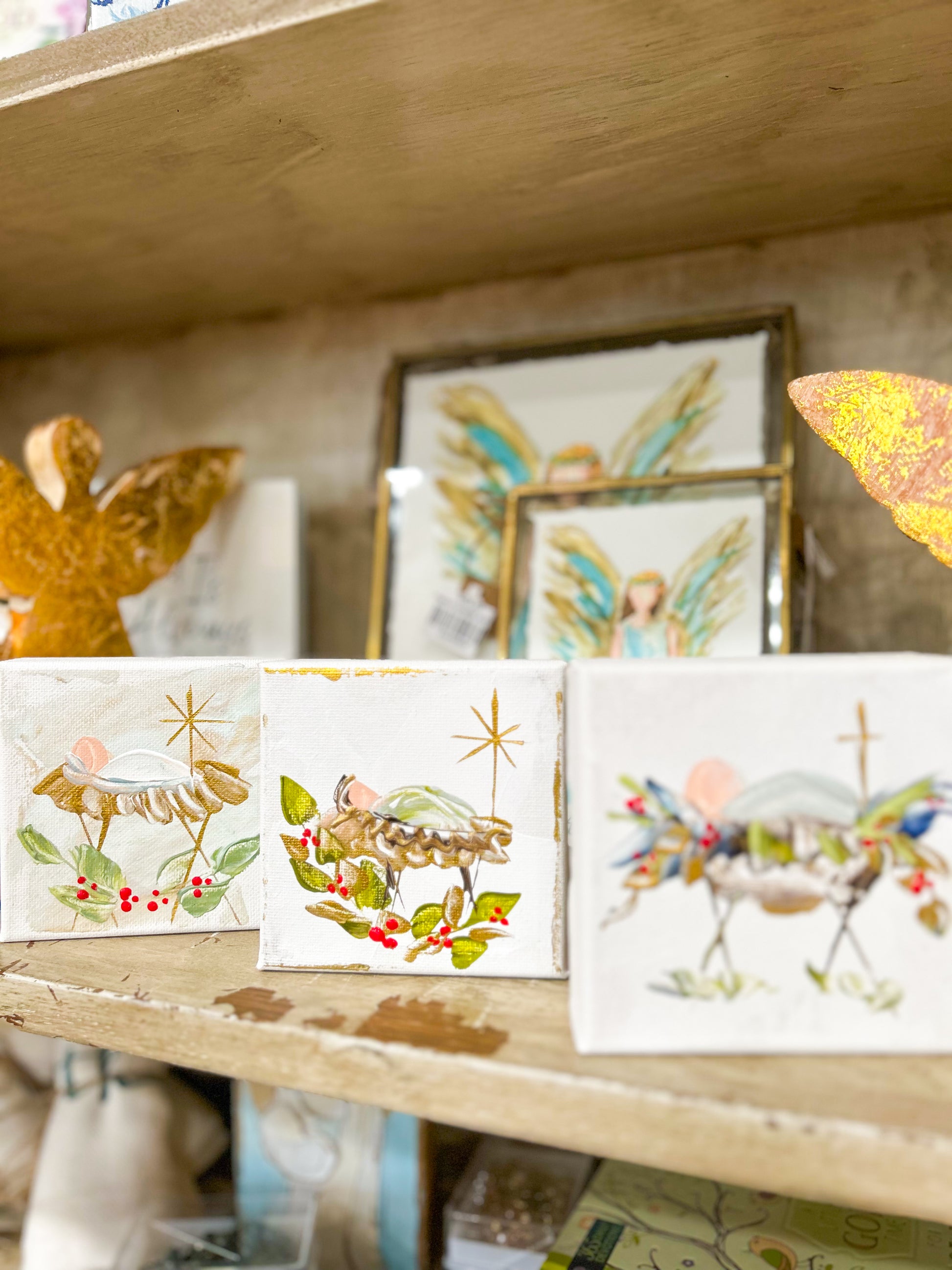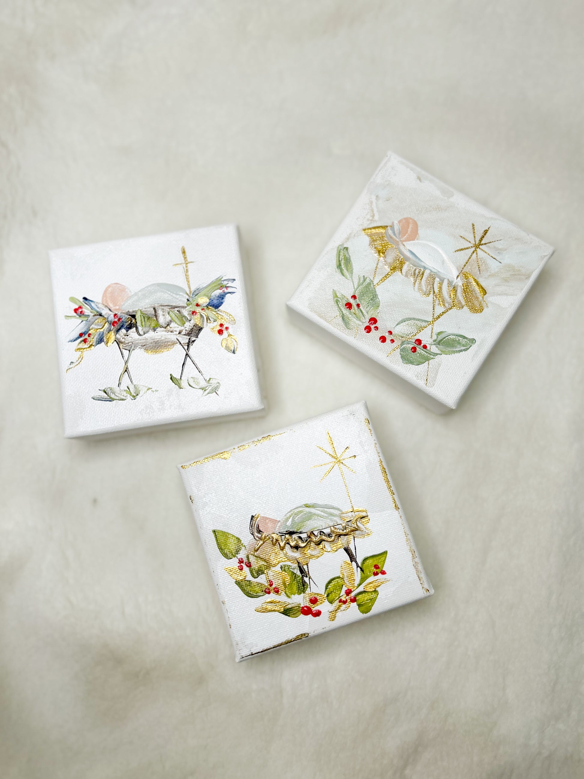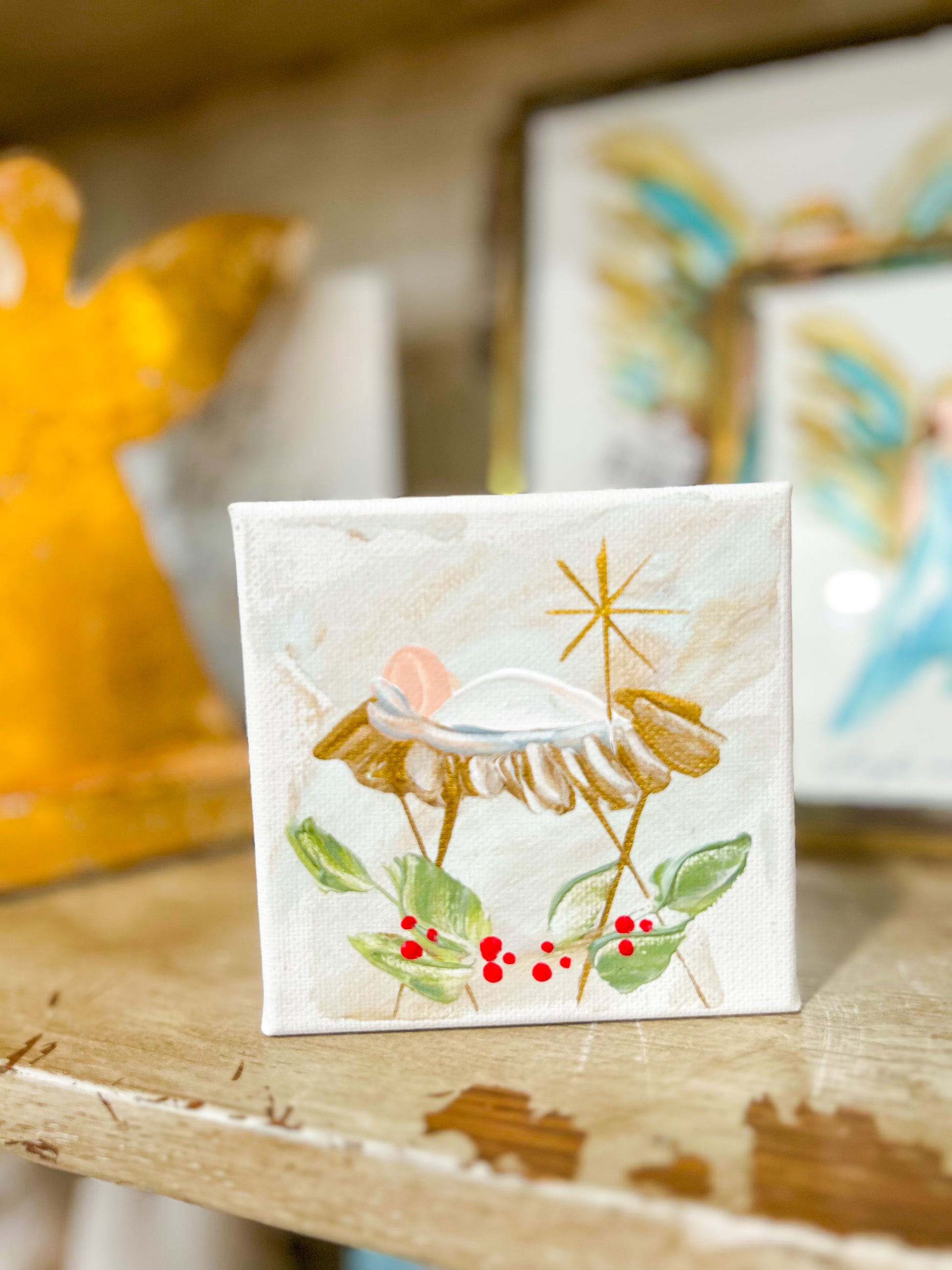 Celebrate the sweetest holiday tradition with this charming 4x4 canvas featuring Baby Jesus in the manger. Its playful design brings warmth and joy to any space, perfect for spreading festive cheer. A delightful addition to your holiday décor, this art piece radiates innocence and love in every brushstroke.