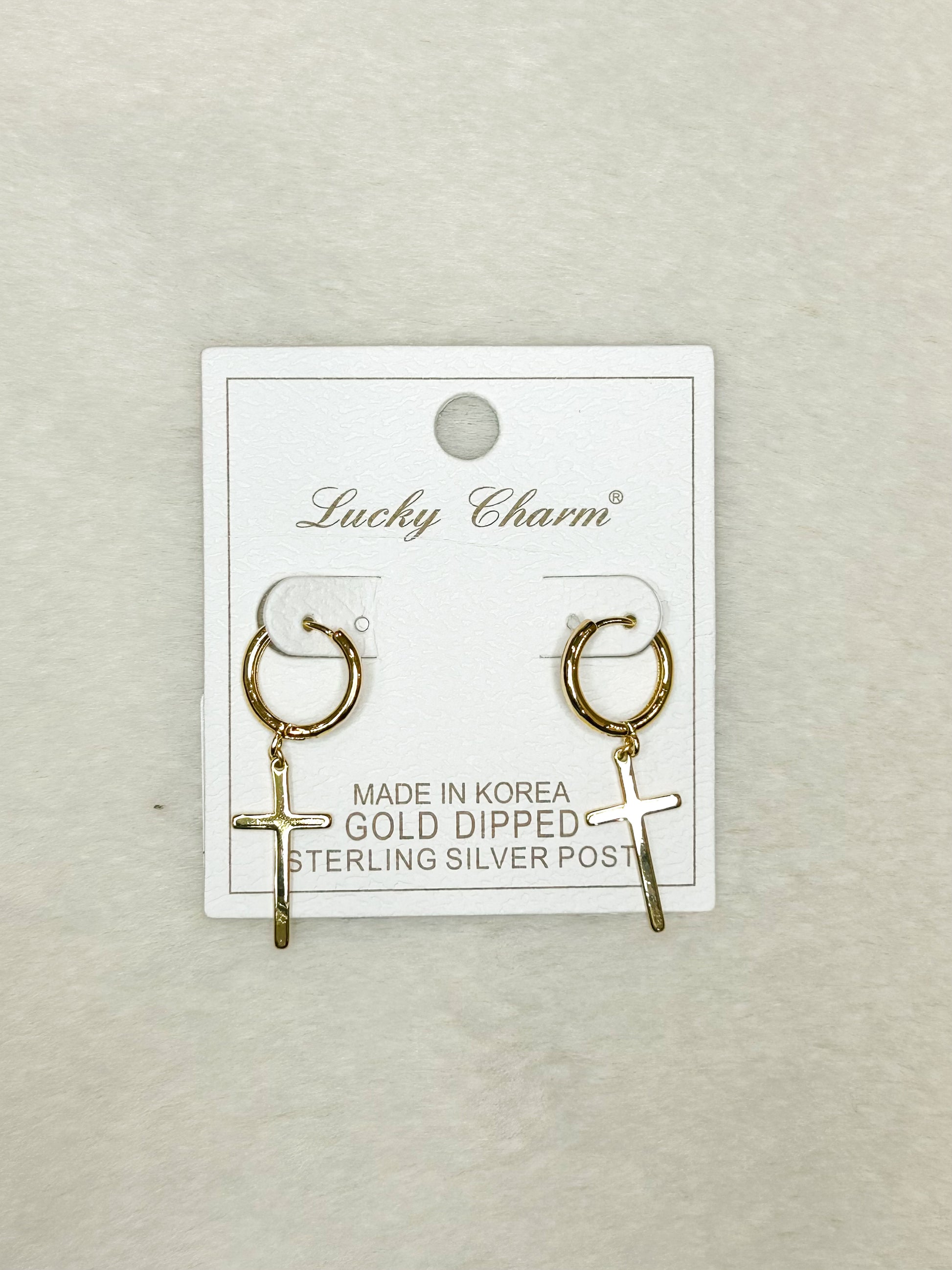 Lucky Charm Gold Cross Huggie Earrings feature delicate cross charms suspended from gold-dipped huggie hoops, combining timeless spiritual symbolism with contemporary elegance. The sterling silver posts ensure comfort for all-day wear while the warm gold finish adds a refined touch to any ensemble. Perfect for layering or wearing solo, these versatile earrings transition seamlessly from casual to formal occasions, making them an essential addition to your jewelry collection.