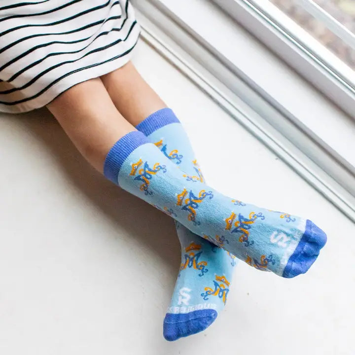 When you see the “A” & “M” intertwined you may think: Ave Maria, latin for Hail Mary, the words of honor the angel Gabriel used to first address the Virgin at the Annunciation. However, the original meaning of this Marian symbol represents the latin phrase, “Auspice Maria,” meaning, “under the protection of Mary.” In many Marian images, Mary is seen stomping on the head of the serpent, representing Satan. Wear these socks and remember to call upon Mary to protect you from the attacks of the evil one and draw you closer to her Son!