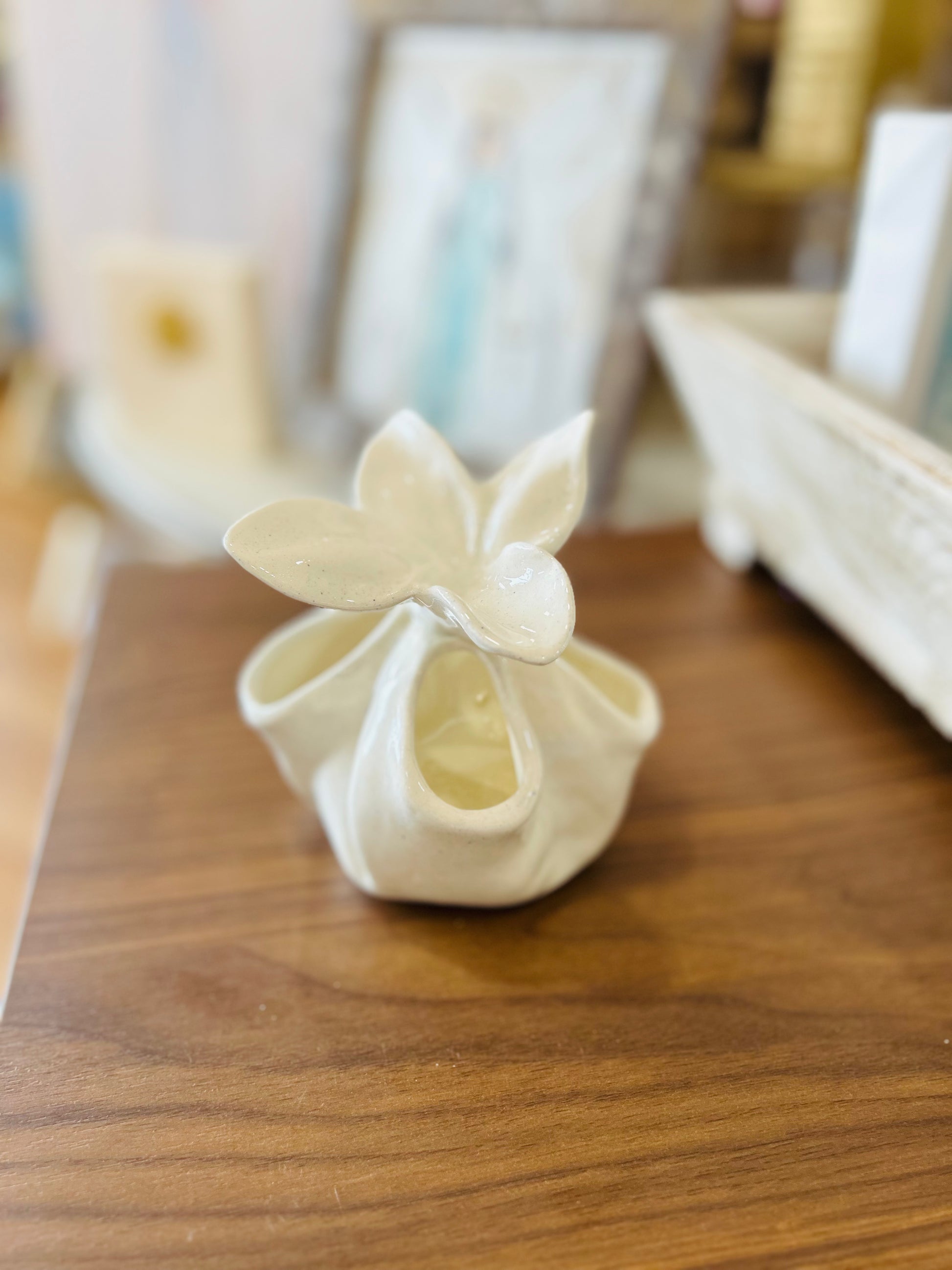 A vintage cream ceramic sponge holder with a simple, utilitarian form and warm neutral glaze. Once a hardworking kitchen sink staple, now sweetly reimagined as a petite bud vase for fresh or dried florals, adding quiet cottage charm to any nook.