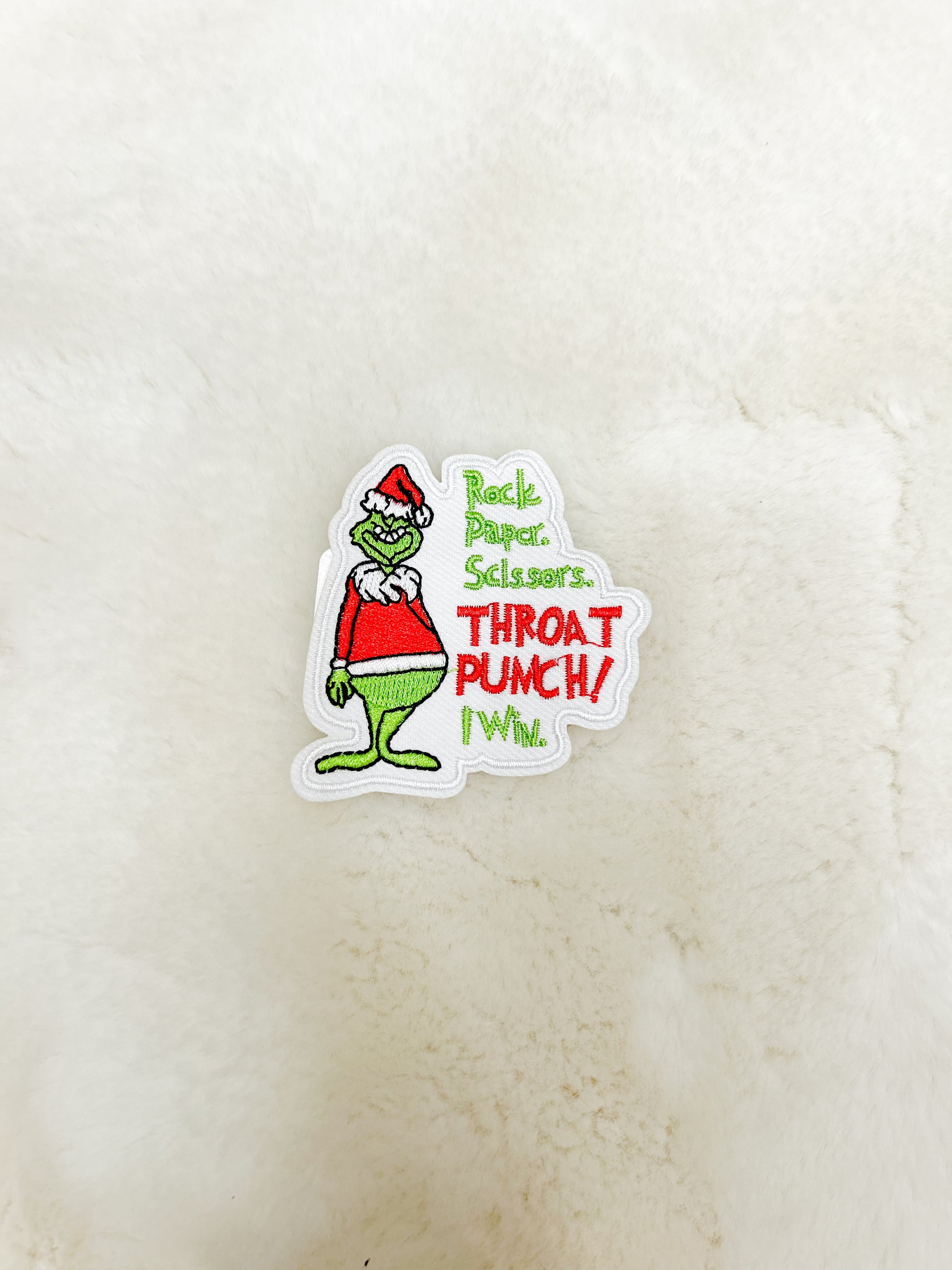 The Patch-Grinch Rock, Paper, Scissors, Throat Punch offers a witty and unconventional twist on the classic game. Crafted for those who appreciate clever humor and a dash of irreverence, this patch adds a refined edge to your collection. Perfect for adorning jackets, backpacks, or hats, it makes a subtle yet bold statement with its distinctive design. Elevate your style with this sophisticated blend of playful rebellion and classic charm.