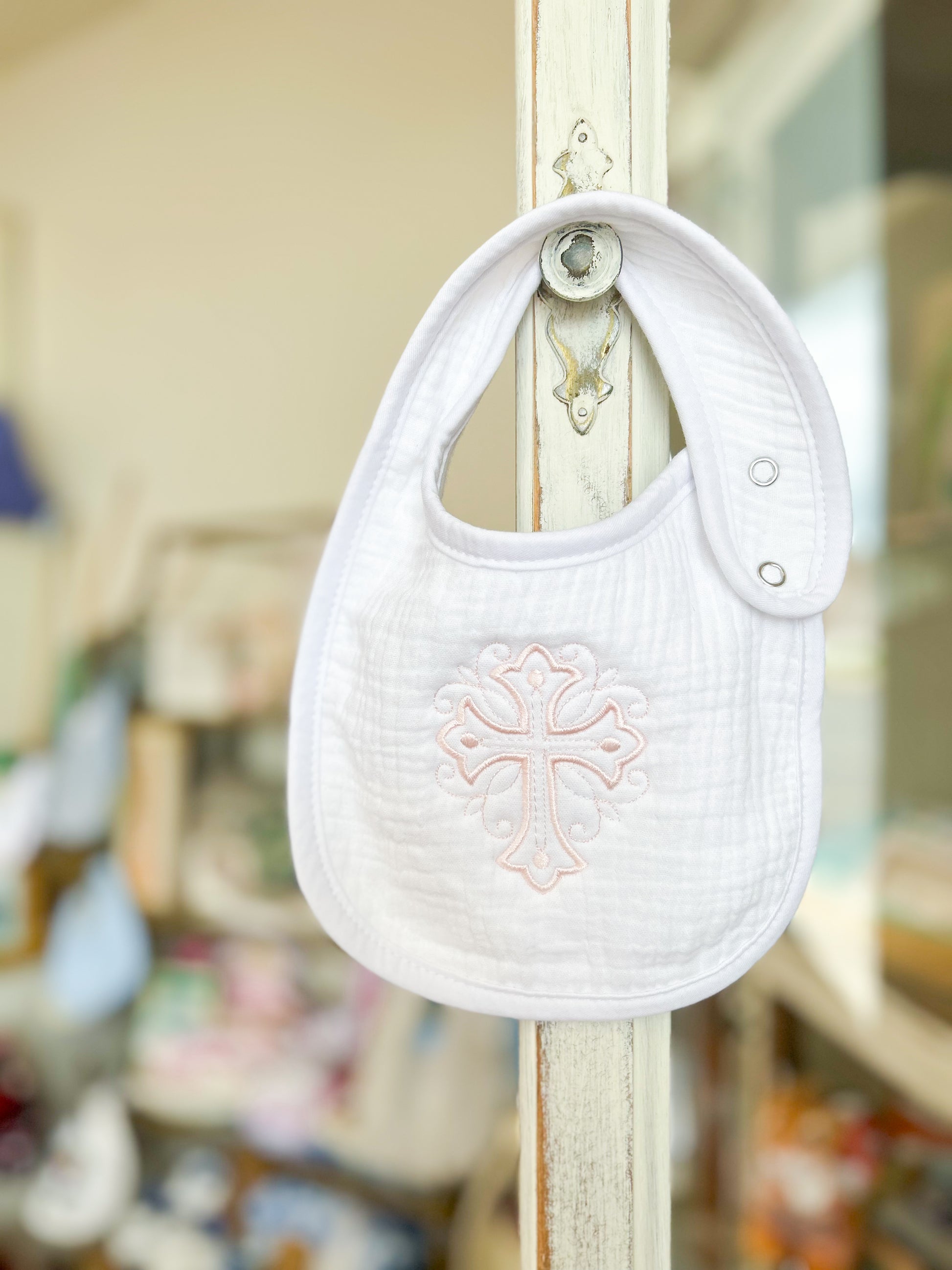 This charming white bib features a delicate pink embroidered cross, adding a sweet vintage touch to mealtime. Soft and comfy, it keeps your little one clean while bringing a playful pop of color to their outfit. Perfect for everyday wear or special occasions!