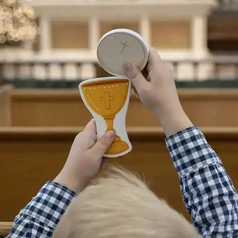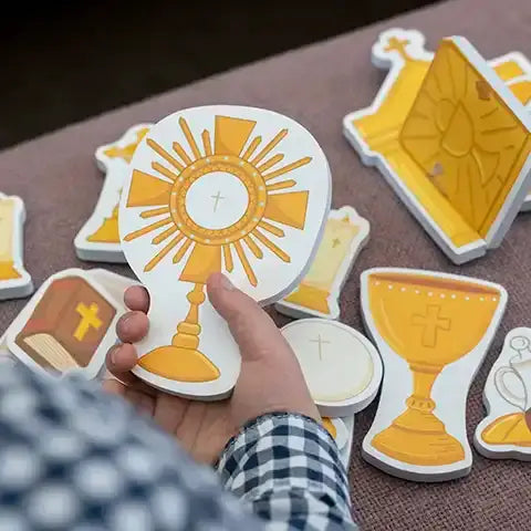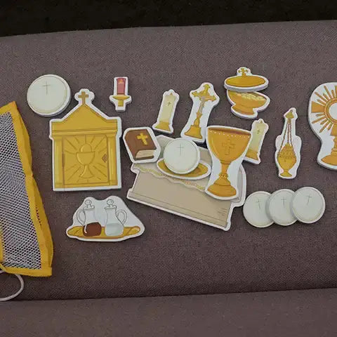 The perfect companion for serene moments in the car, church, or bath, our Quiet Mass Set helps children learn the vessels, rites, and importance of Mass in an interactive