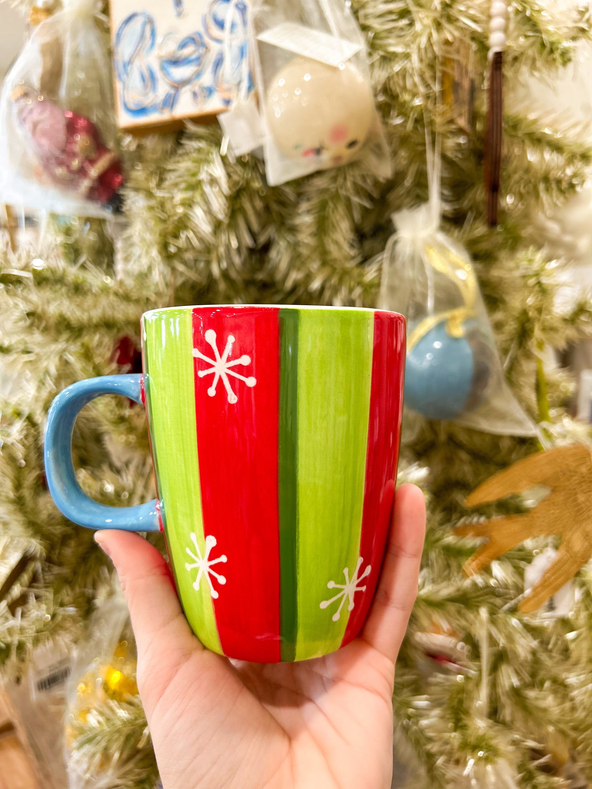 Elevate your holiday table with this sophisticated Christmas mug, featuring a striking red and green striped design accented with delicate snowflake motifs. Perfect for warming hands around hot cocoa, coffee, or tea during festive gatherings, this seasonal piece combines timeless winter elegance with vibrant color. An ideal gift for holiday enthusiasts or a charming addition to your own seasonal collection.