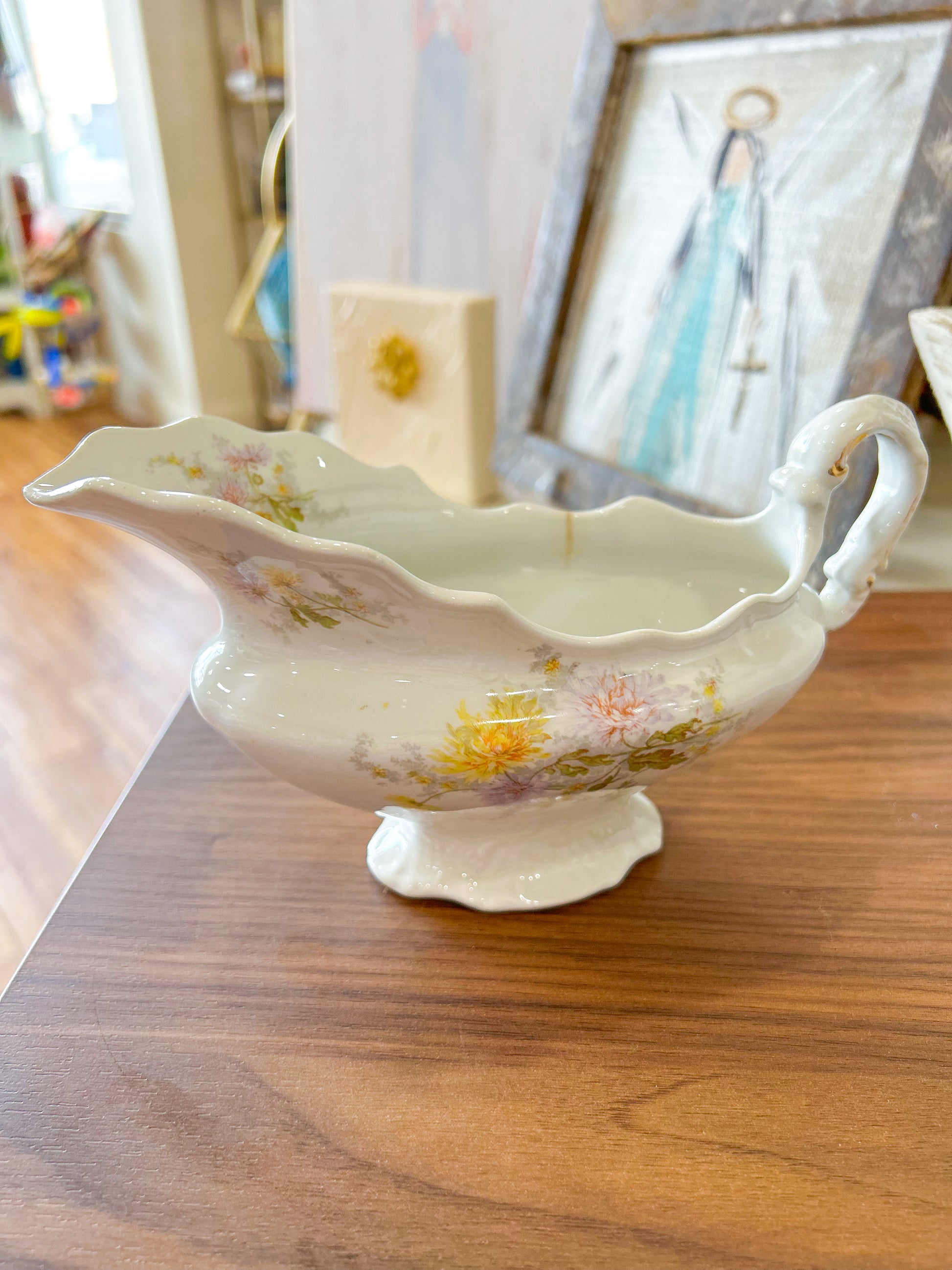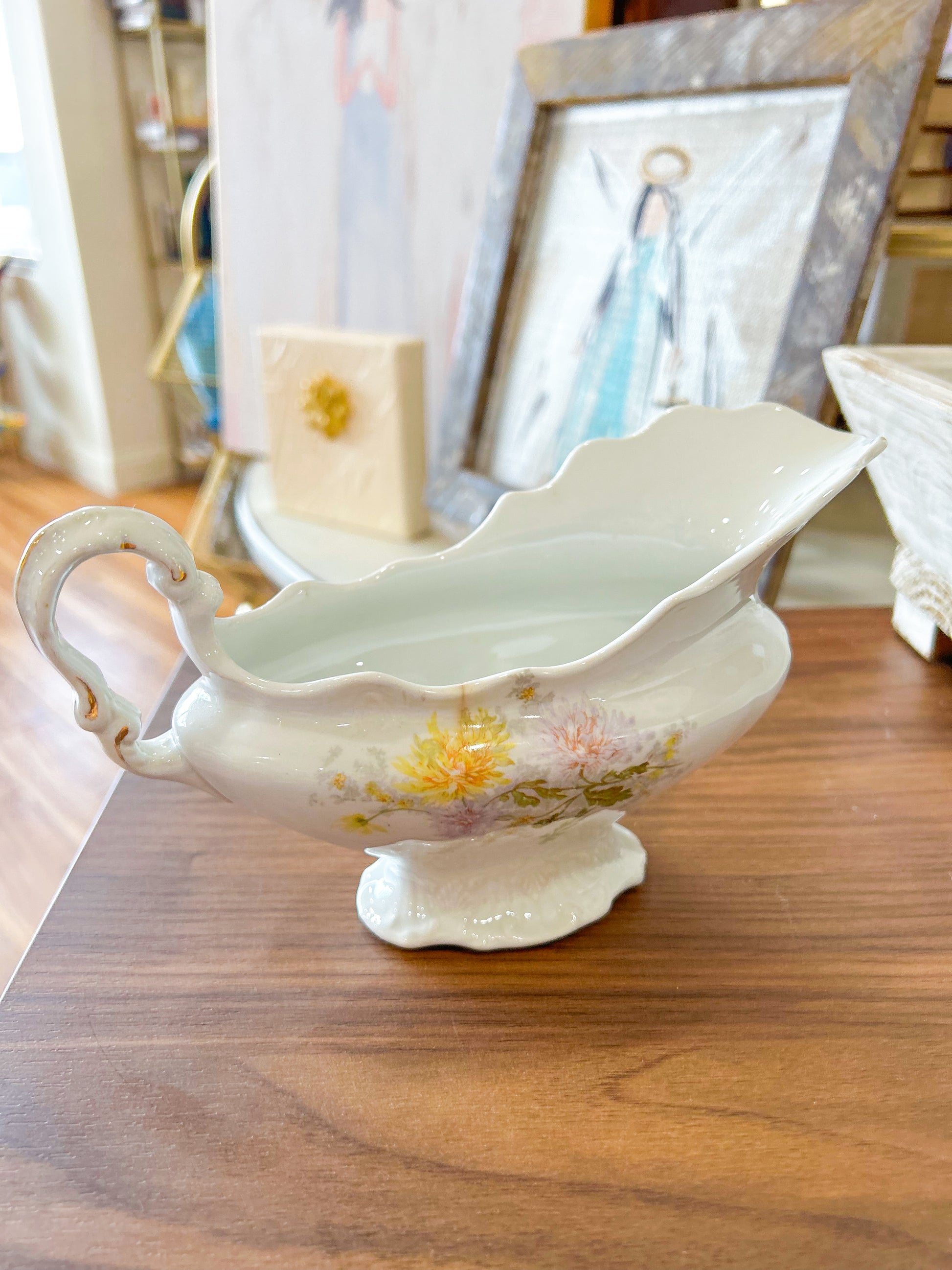 A vintage floral gravy bowl, adorned with soft hand-painted blooms and classic vintage charm. Once a table-ready serving dish, now beautifully reimagined for kitchen display, holding florals, or even as a jewelry catchall, adding a touch of Southern cottage warmth to any space.