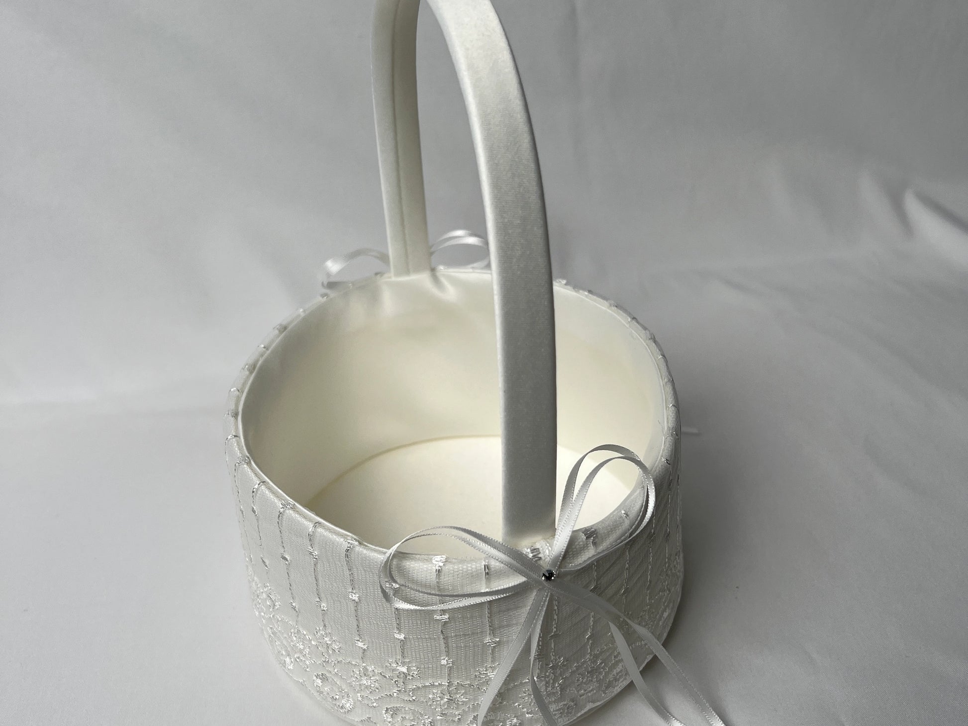Round Wedding Flower Basket with Bows, Pearls, and Lace