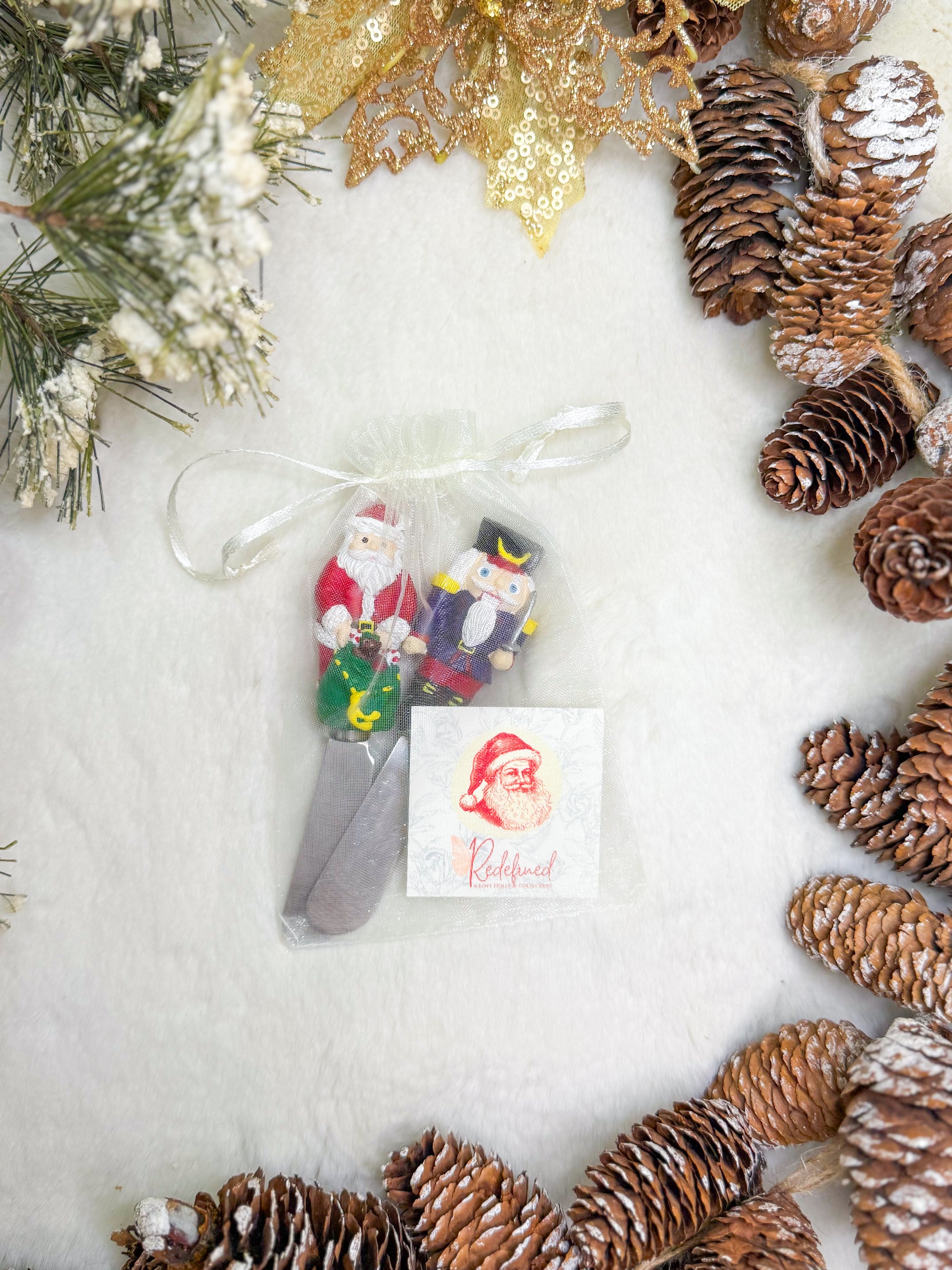 Bring a touch of classic holiday charm to your table with this vintage Santa & Nutcracker butter knife set. Each piece features festive handles with intricate detailing, making them both functional and decorative. Perfect for adding a nostalgic sparkle to your Christmas charcuterie boards, dessert spreads, or holiday brunch. A timeless accent that blends merry whimsy with elegant tradition.