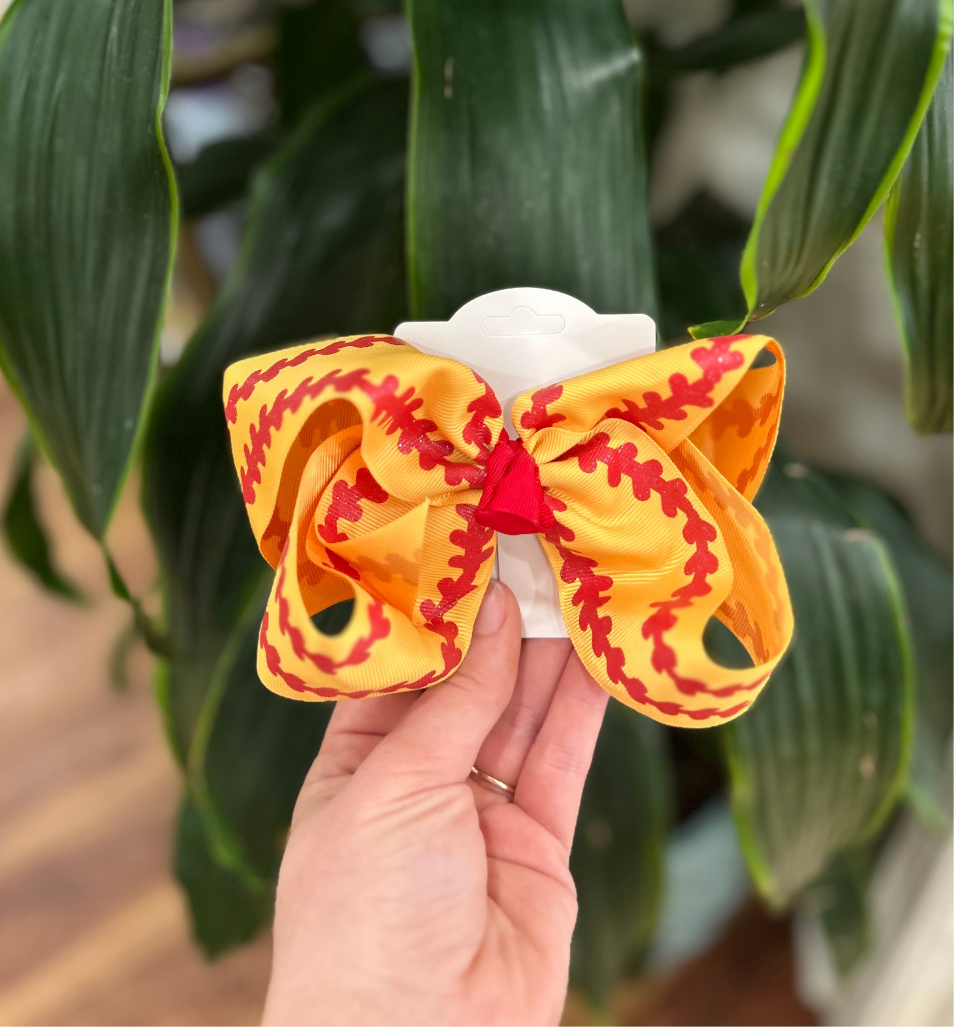 Get in the game with this playful Softball Bow! Featuring a fun softball print ribbon, this bow adds a sporty touch to any outfit. Perfect for showing off your love for the game or as a unique accessory for game day. Score a home run with this quirky, must-have bow!