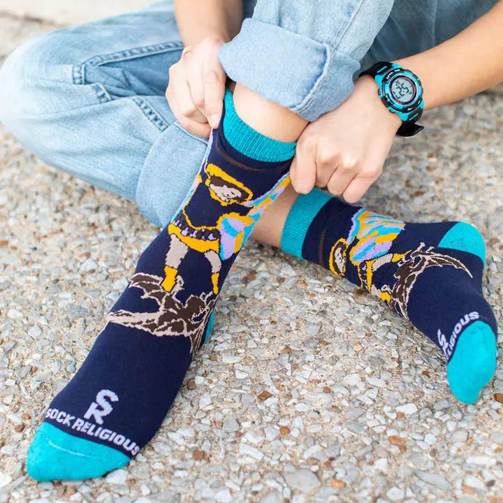 Equip your child with the courage and protection of St. Michael the Archangel through our St. Michael Kids Socks. These Catholic socks for children feature a dynamic design showcasing St. Michael in his iconic armor, wielding a sword and shield, symbolizing his role as the leader of God's heavenly army. Known as the defender against evil, St. Michael's name means "one who is like God," and he is celebrated for his unwavering commitment to safeguarding the faithful. Crafted to fit comfortably on young feet, these socks serve as a daily reminder of St. Michael's protective presence. Whether your child is at school, attending Mass, or playing with friends, these socks provide a unique way to express their faith and inspire conversations about the importance of spiritual strength and protection. The vibrant imagery not only adds a touch of inspiration to their outfit but also encourages them to call upon St. Michael in their daily challenges. These socks make a thoughtful gift for occasions such as birthdays, First Communion, or as a special addition to Easter baskets. Encourage your child to walk confidently, knowing they have a heavenly protector by their side with the St. Michael Kids Socks.
