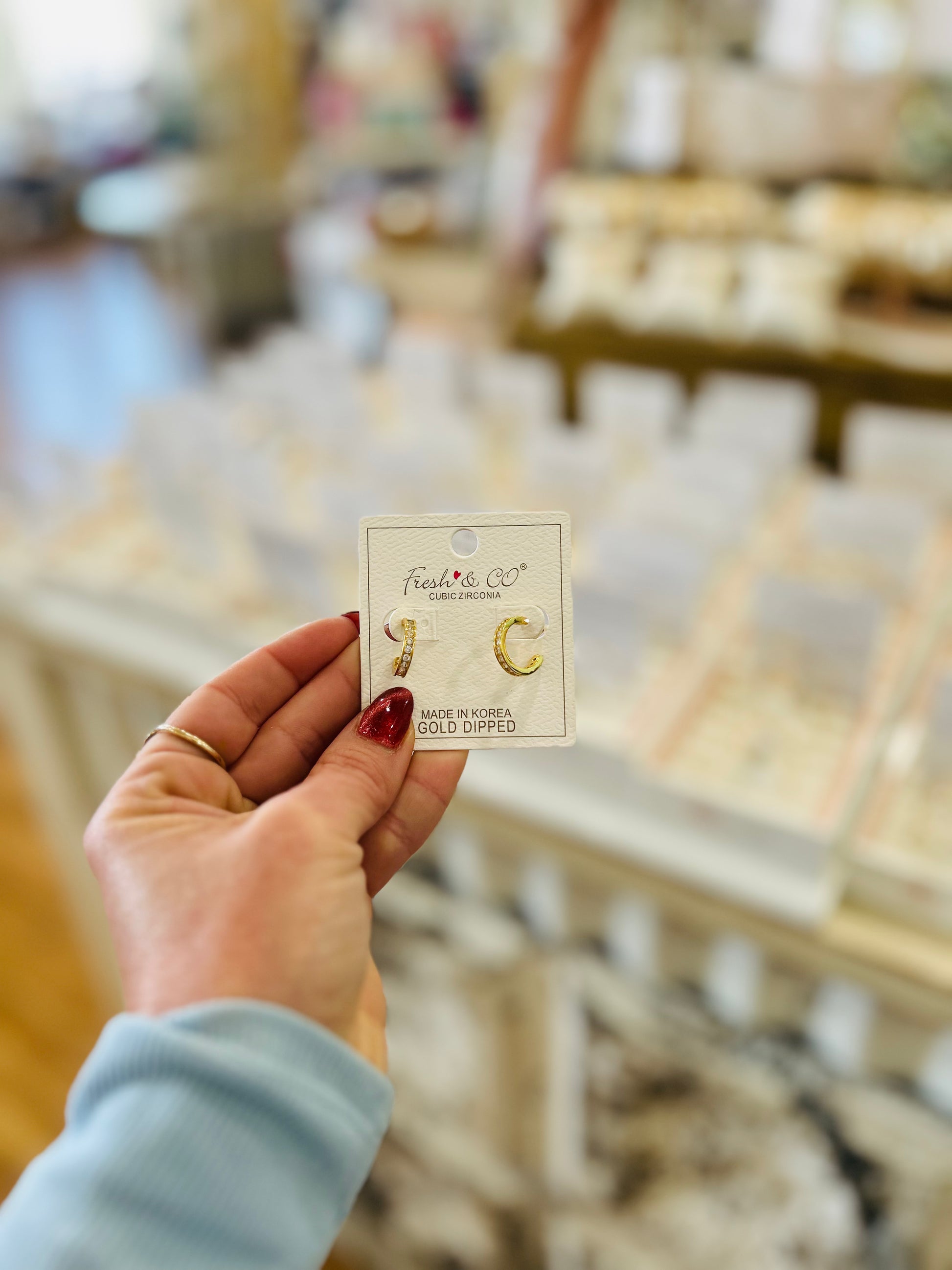 The Camille Hoop – Gold Rhinestone Mini Hoops are a timeless staple with just the right amount of sparkle. Designed in a classic small hoop silhouette, these gold earrings are accented with delicate rhinestones that catch the light beautifully, making them perfect for everyday wear or dressing up for special occasions. Lightweight and versatile, they pair effortlessly with both casual and dressy looks, adding a refined touch of shine to any outfit.