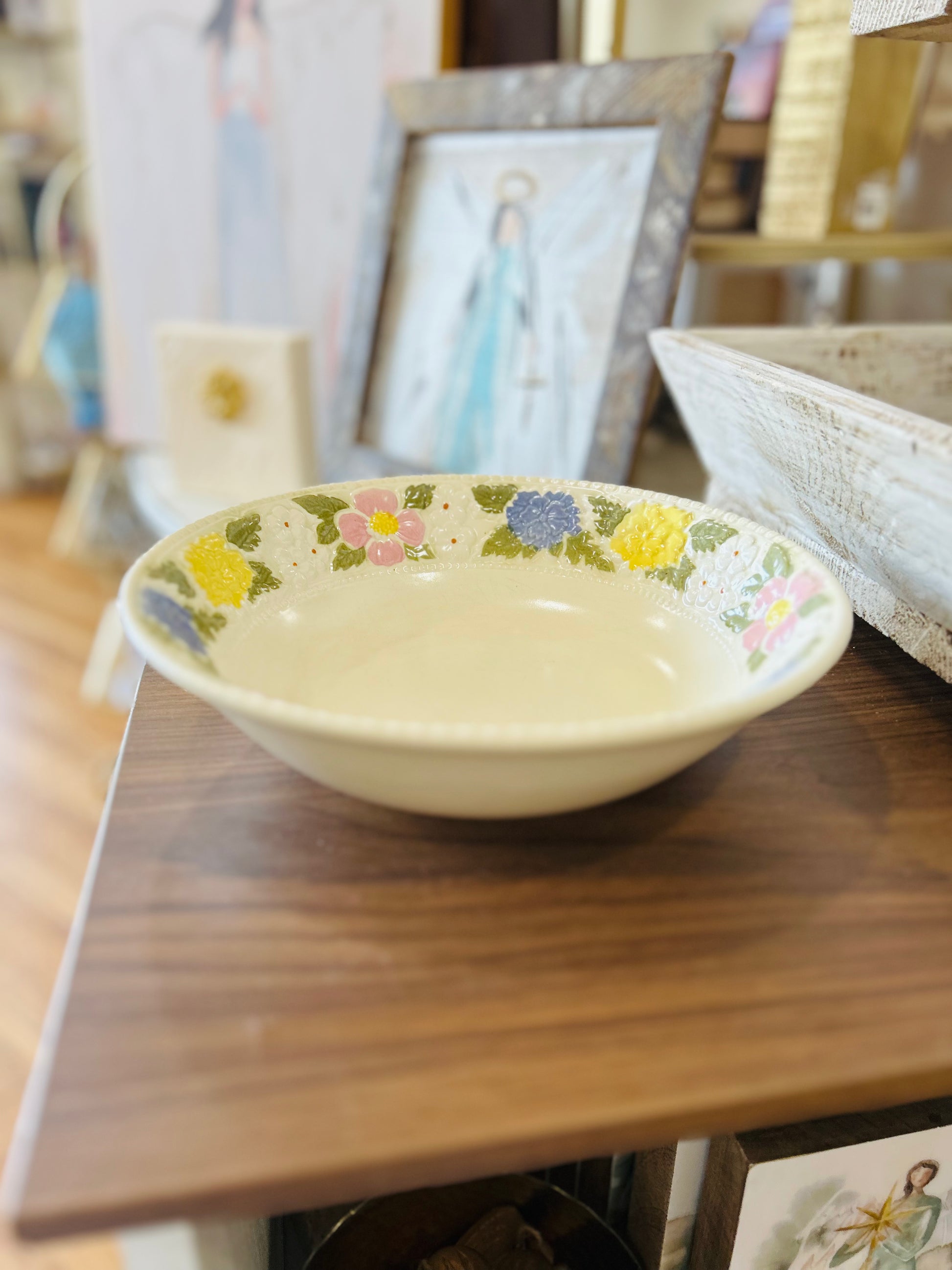 An ironstone serving bowl in the “Garden Party” pattern, featuring an embossed floral design around the rim, hand-painted in soft yellow, blue, and pink blooms. Once a cheerful table-ready serving piece, now thoughtfully reimagined for everyday serving and kitchen use, bringing cottage-garden charm and vintage warmth to your table.