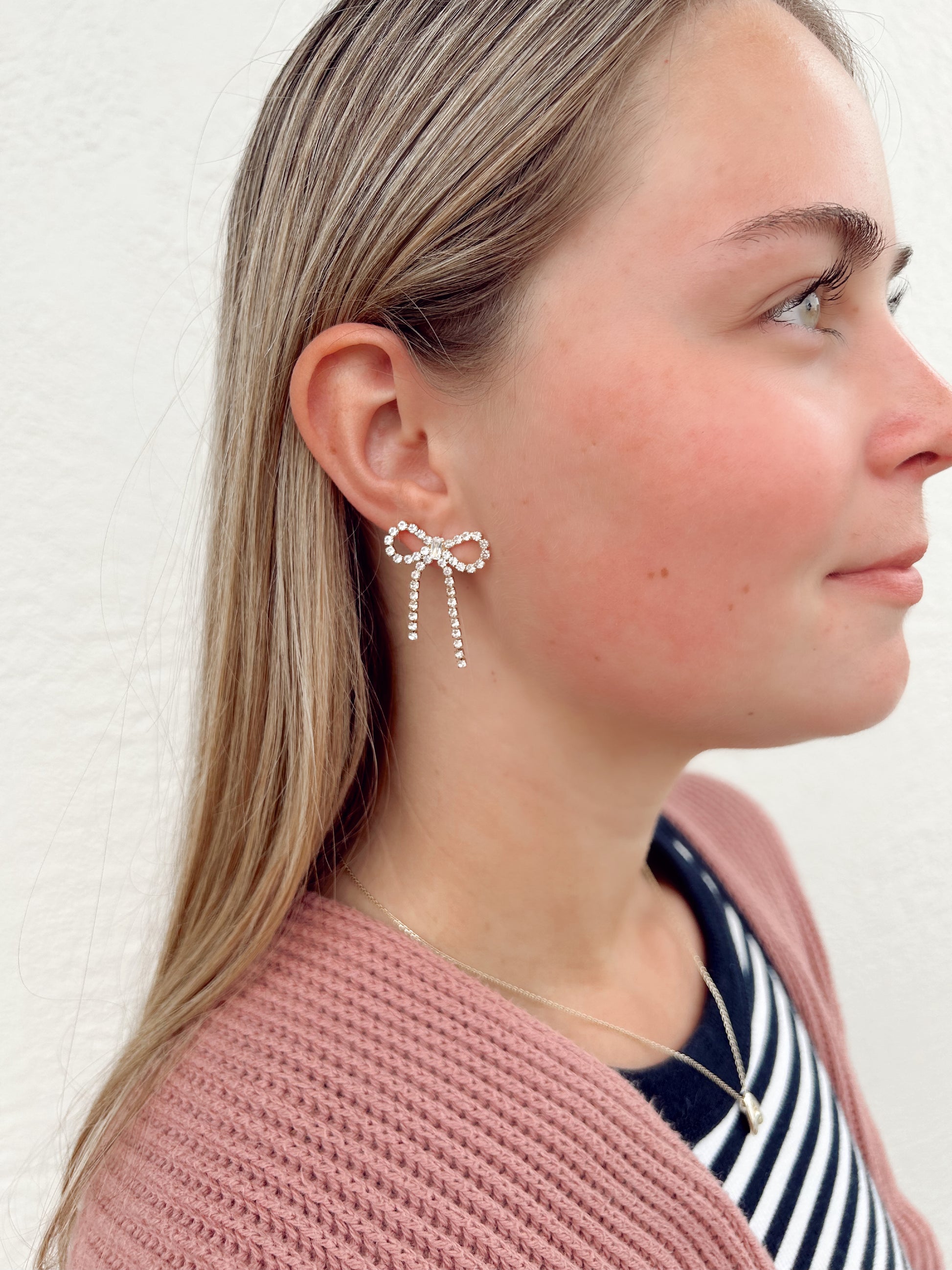 Add a touch of whimsy with our Willow Rhinestone Bow earrings. These playful earrings feature delicate willow branches adorned with sparkling rhinestones, perfect for adding a touch of sparkle to any outfit.